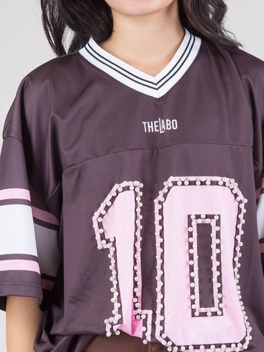 Ispirata alle iconiche divise di football americano, questa t-shirt oversize unisce il fascino sportivo a dettagli preziosi e femminili. Realizzata in morbido tessuto marrone, presenta una scollatura a “V”, spalle scese e maniche ampie per un fit comodo e contemporaneo. Il numero 10 sul davanti è decorato con perle bianche, trasformando un dettaglio sportivo in un elemento di stile luminoso e originale. Perfetta da indossare con jeans, pantaloni larghi o sotto giacche strutturate, questa t-shirt taglia unica è il capo versatile che trasforma ogni outfit in un look moderno e cool.