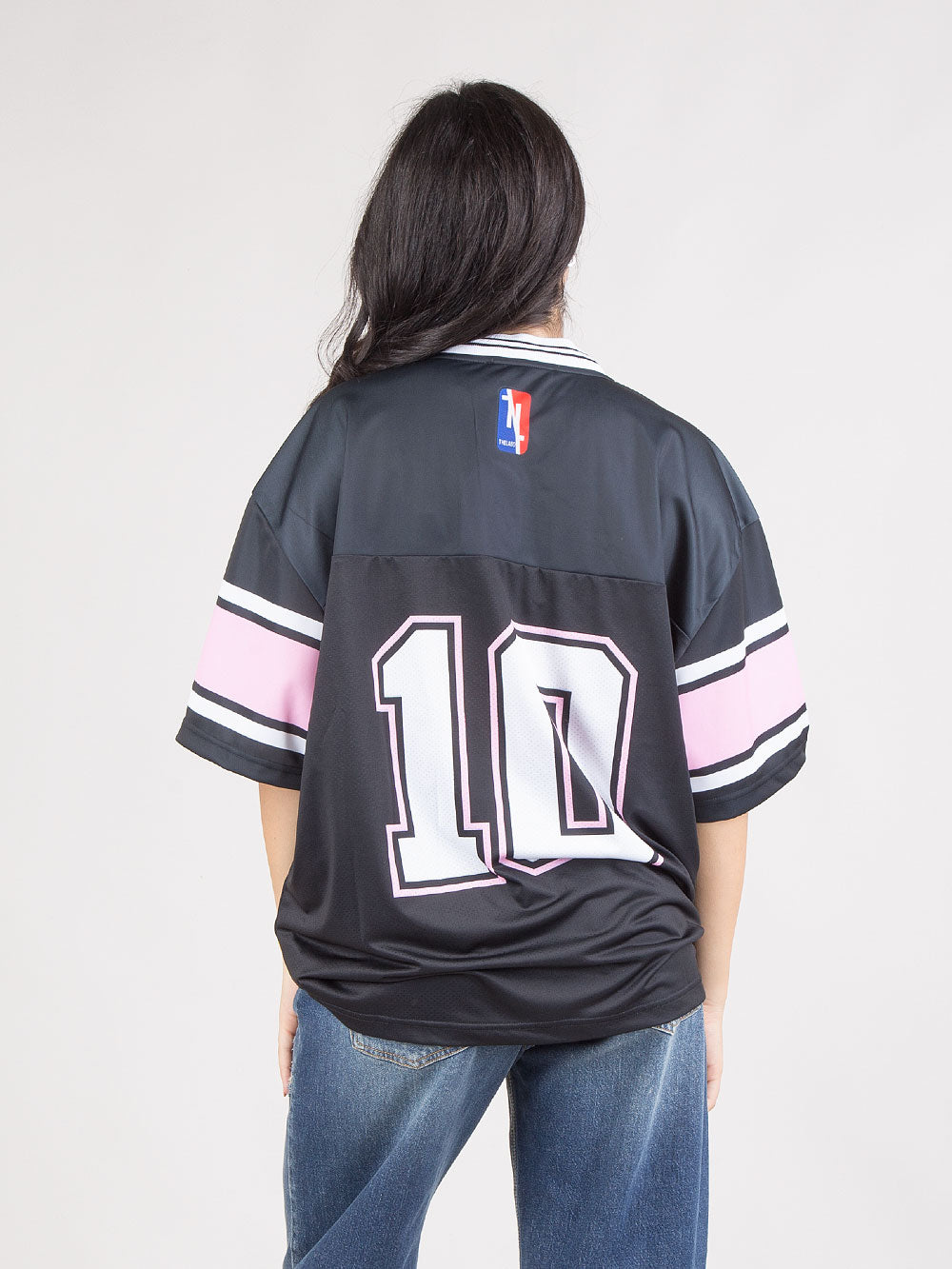 Ispirata alle iconiche divise di football americano, questa t-shirt oversize unisce il fascino sportivo a dettagli preziosi e femminili. Realizzata in morbido tessuto nero, presenta una scollatura a “V”, spalle scese e maniche ampie per un fit comodo e contemporaneo. Il numero 10 sul davanti è decorato con perle bianche, trasformando un dettaglio sportivo in un elemento di stile luminoso e originale. Perfetta da indossare con jeans, pantaloni larghi o sotto giacche strutturate, questa t-shirt taglia unica è il capo versatile che trasforma ogni outfit in un look moderno e cool.