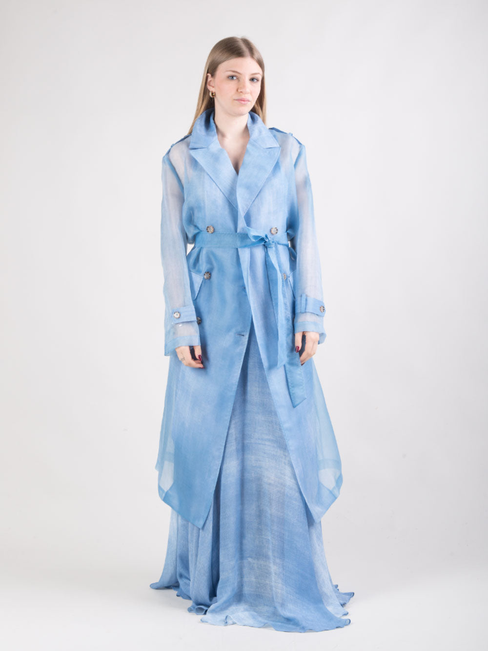 Trench lungo in organza trasparente denim