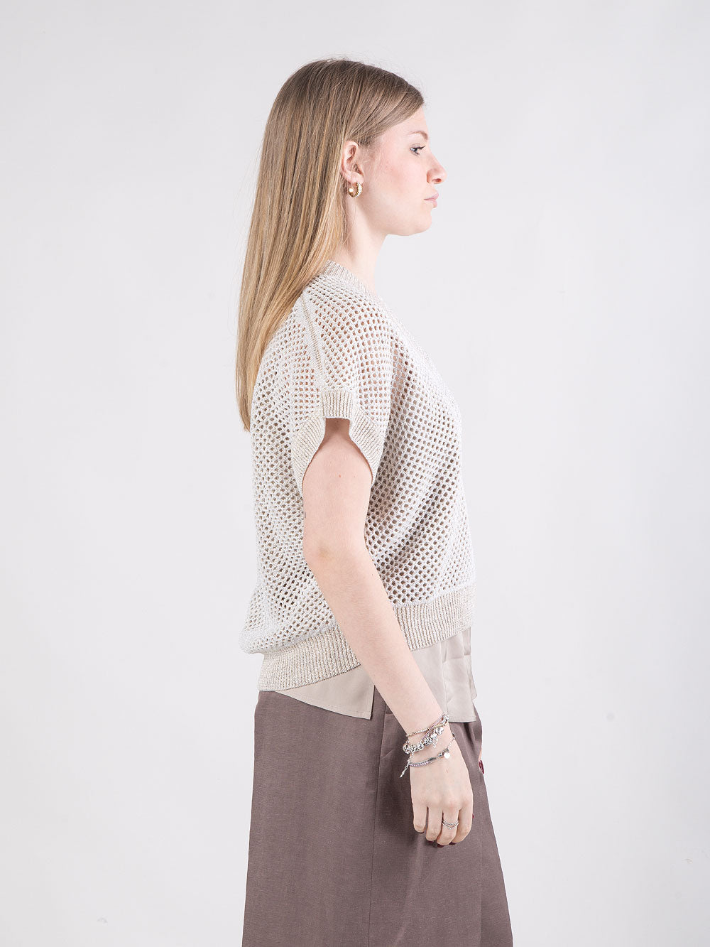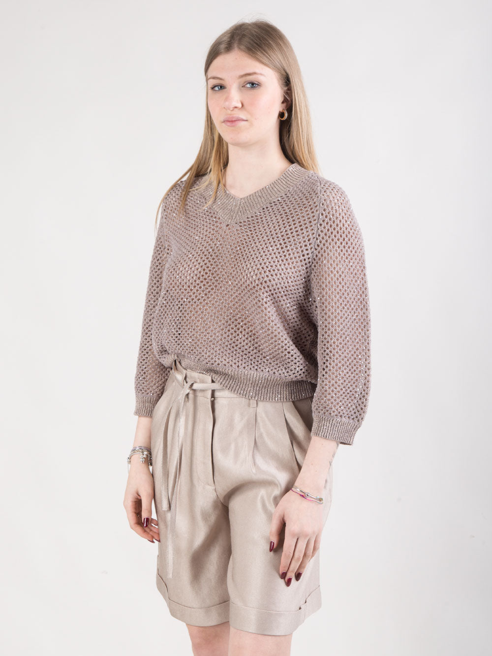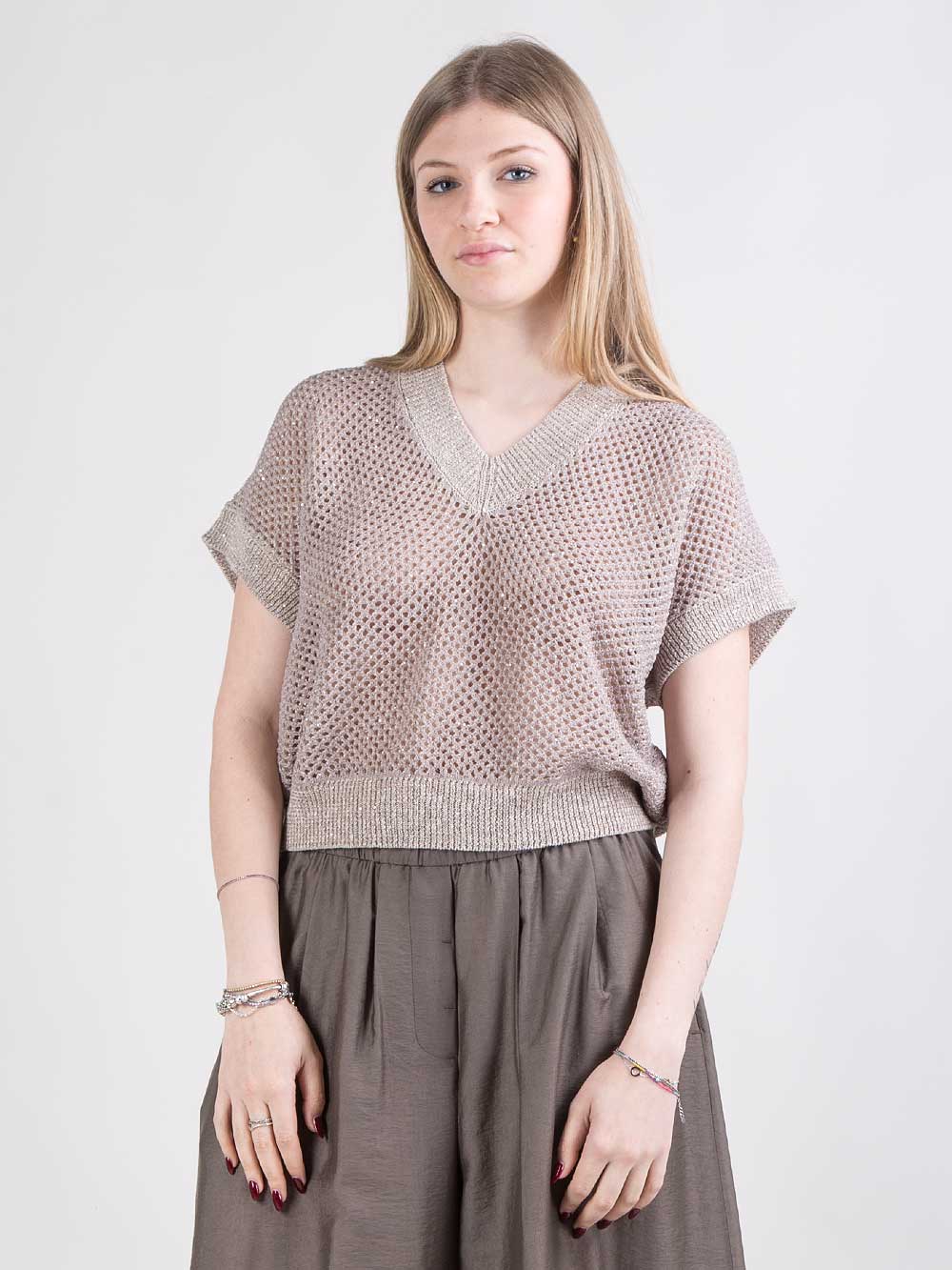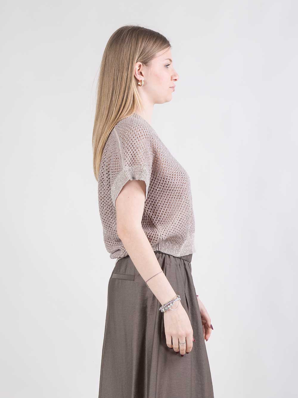 Maglia in filato di lino e cotone con microrete e paillettes