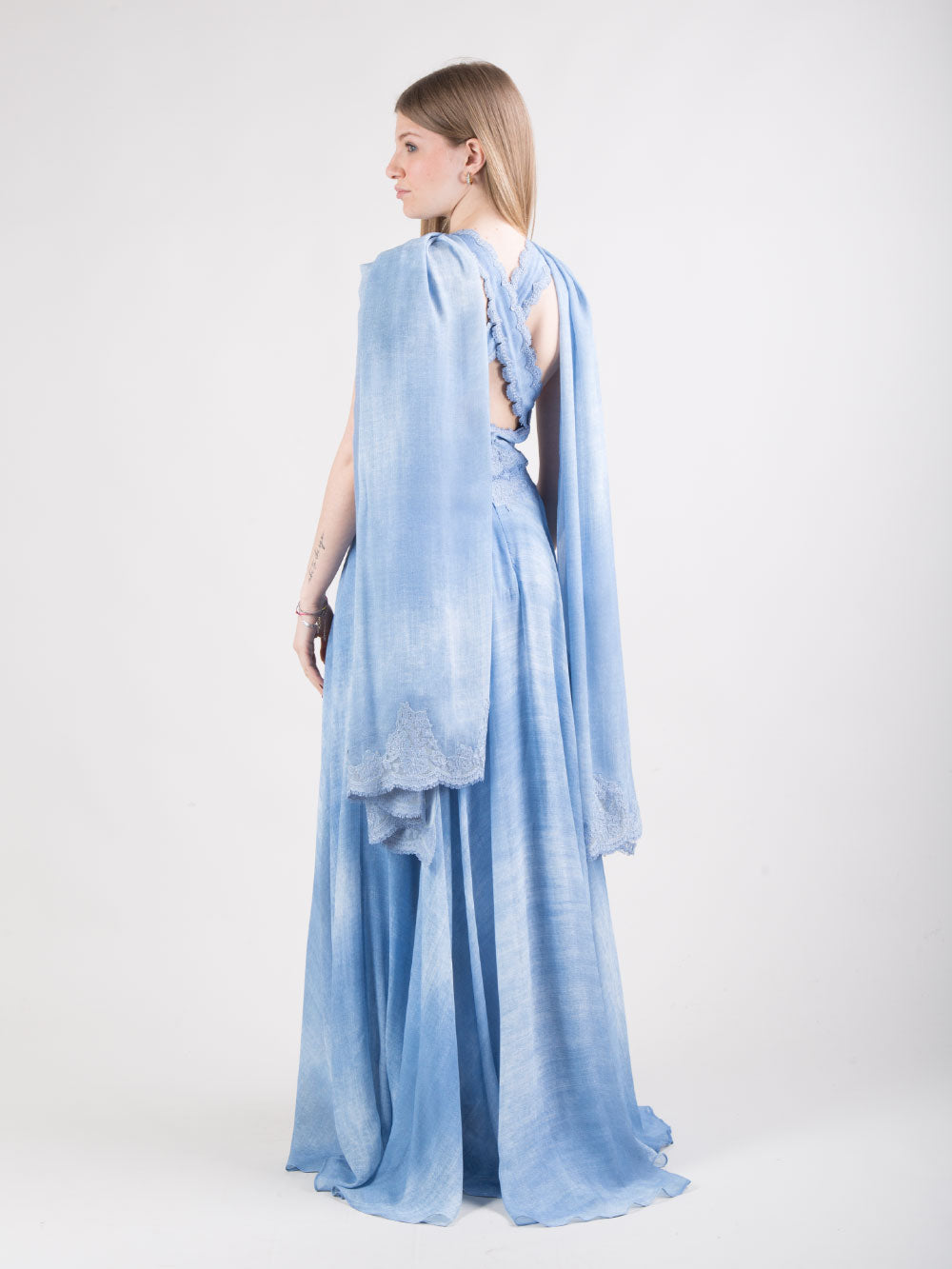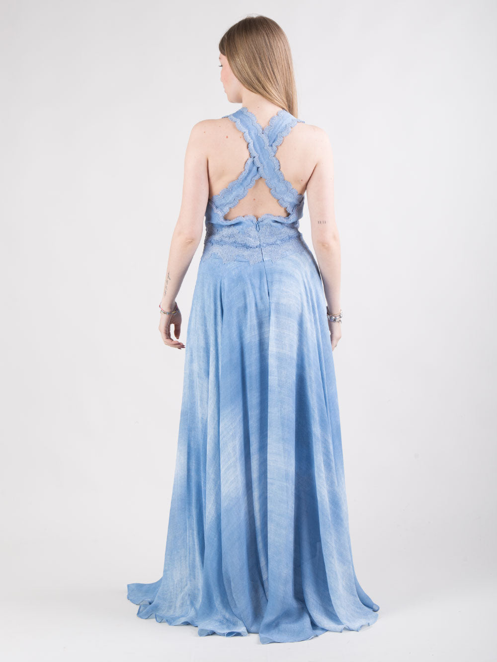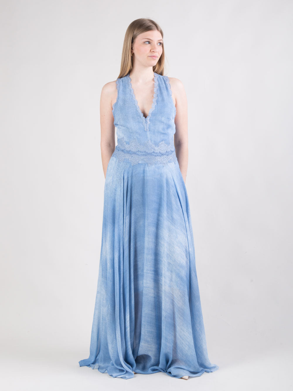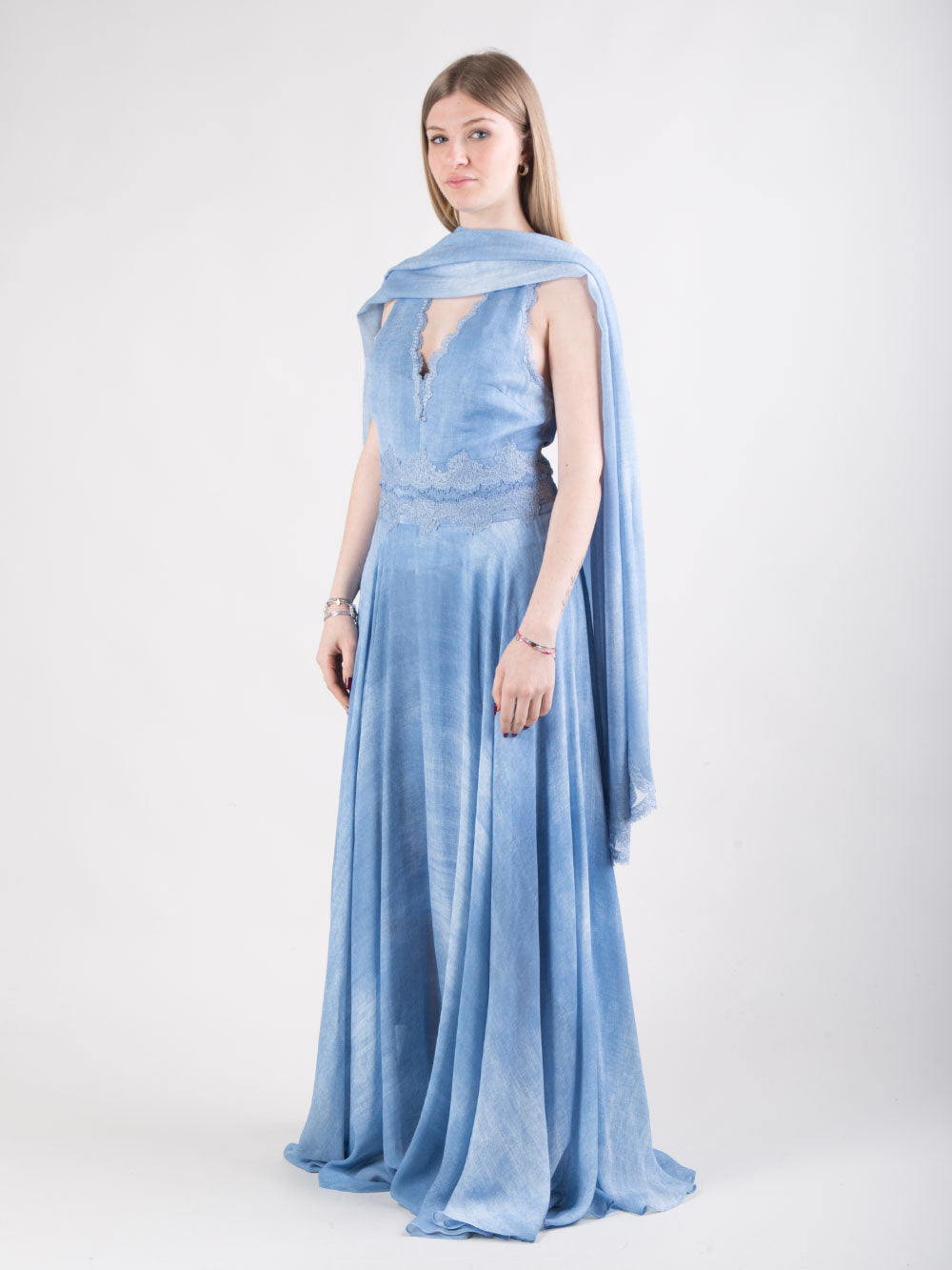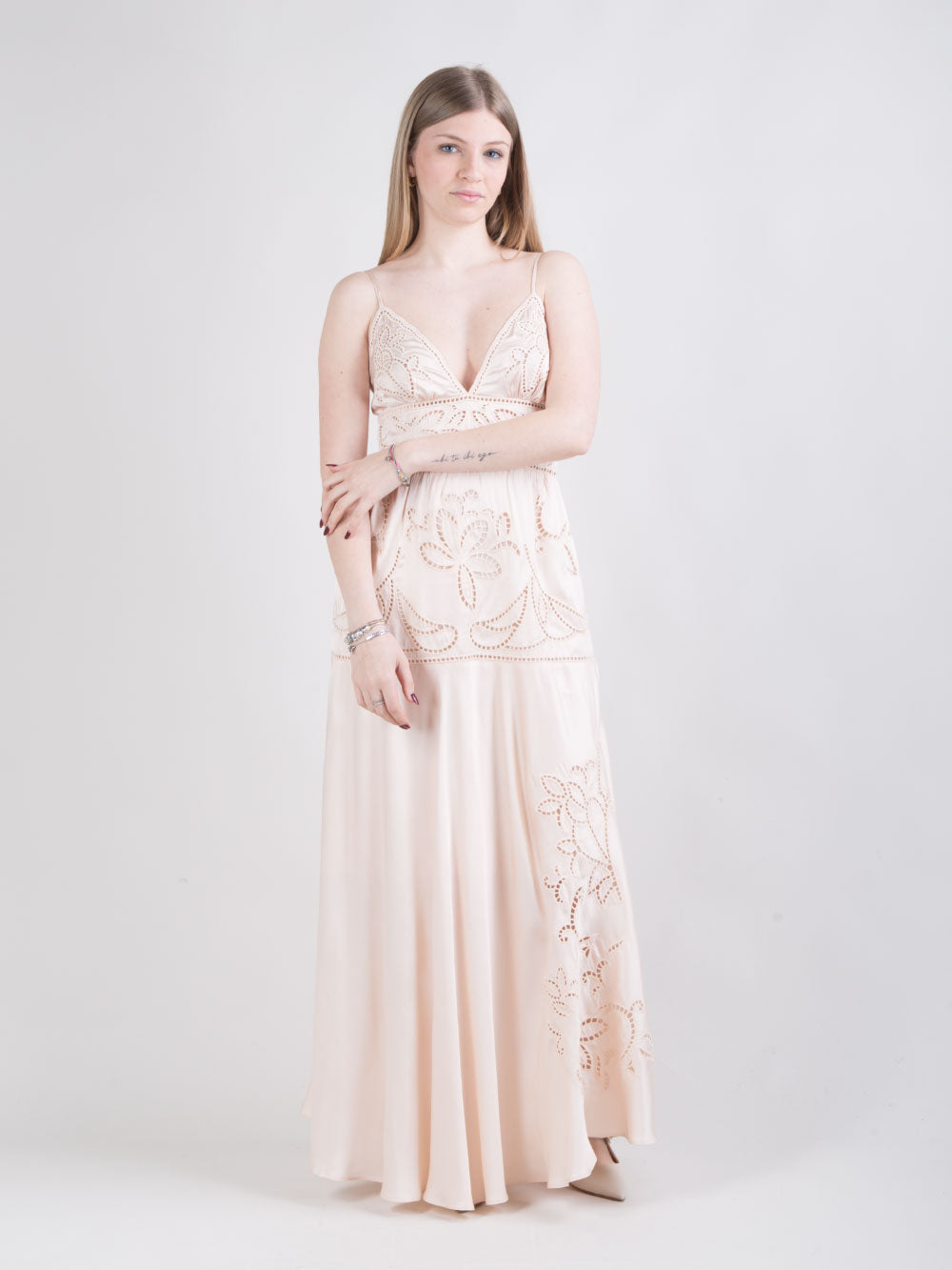 Abito lungo in raso di viscosa con ricamo sangallo