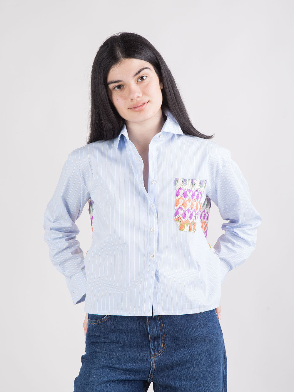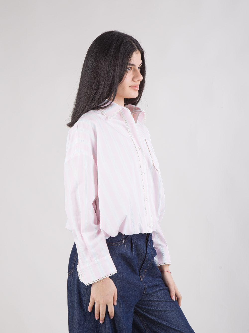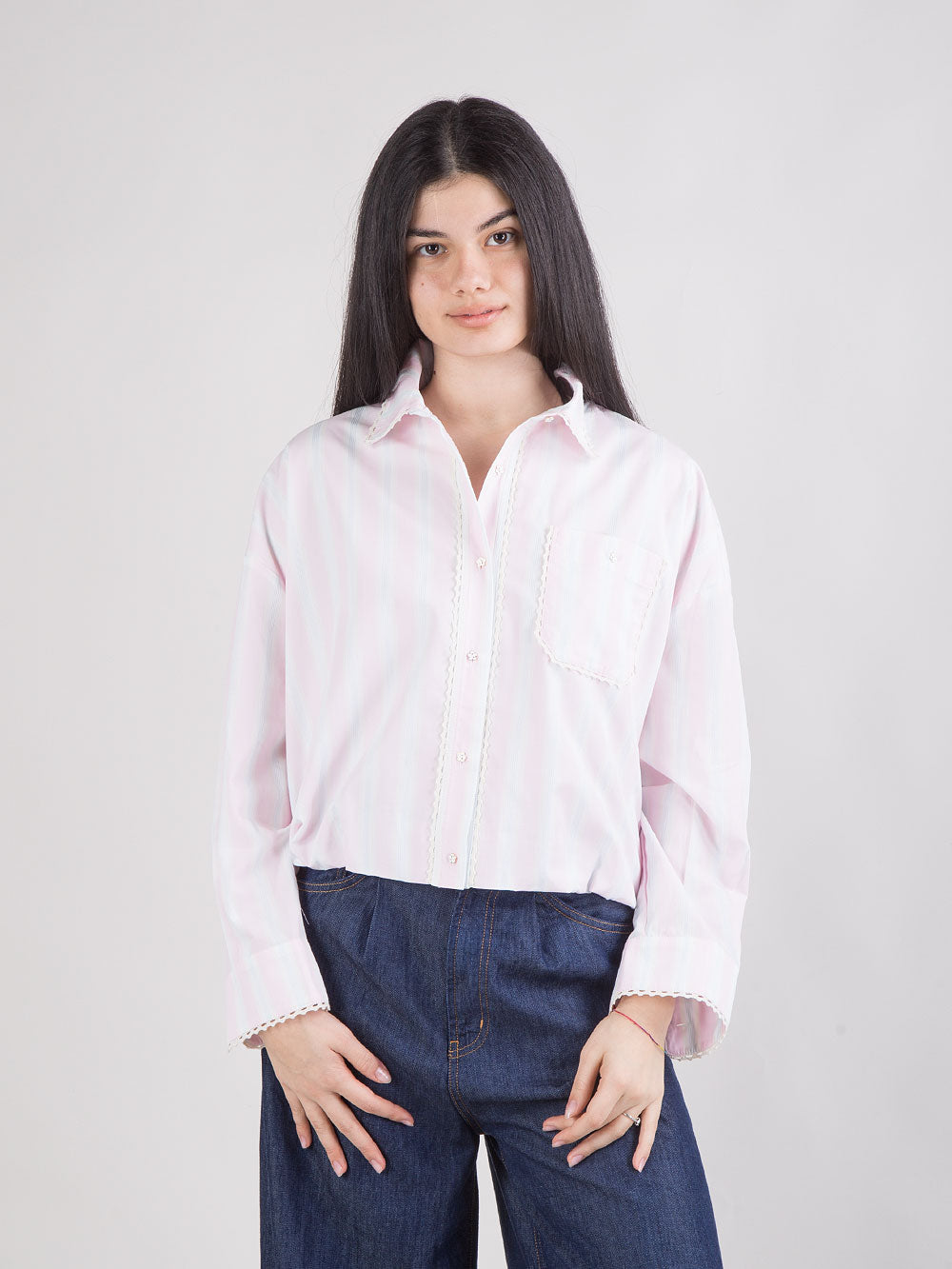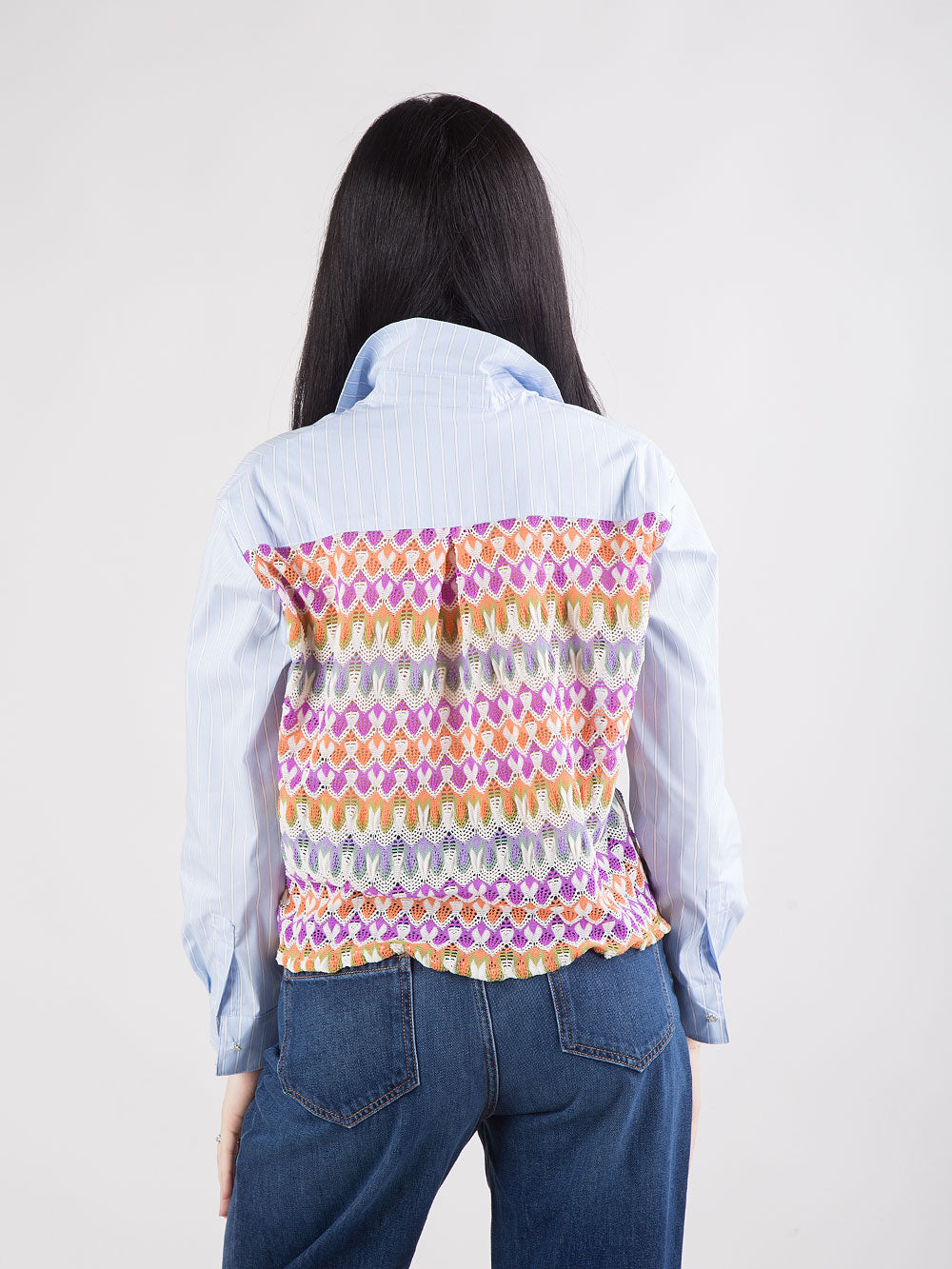 Camicia cropped celeste a righe con ricamo crochet