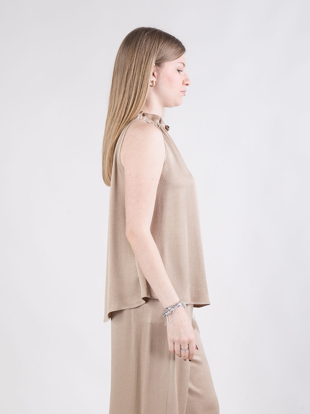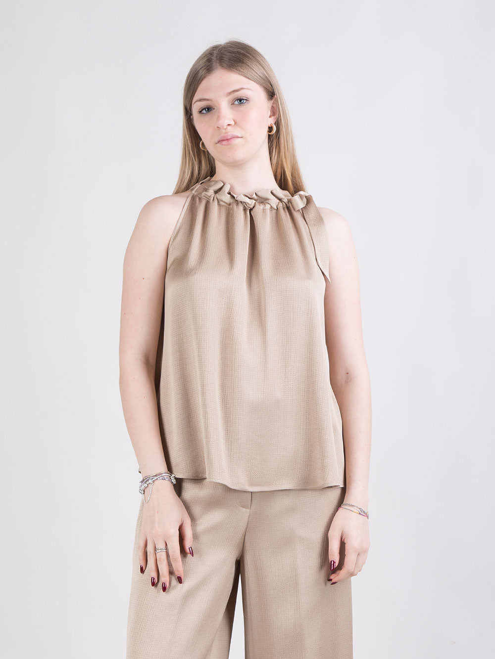Top svasato senza maniche con collo alto arricciato
