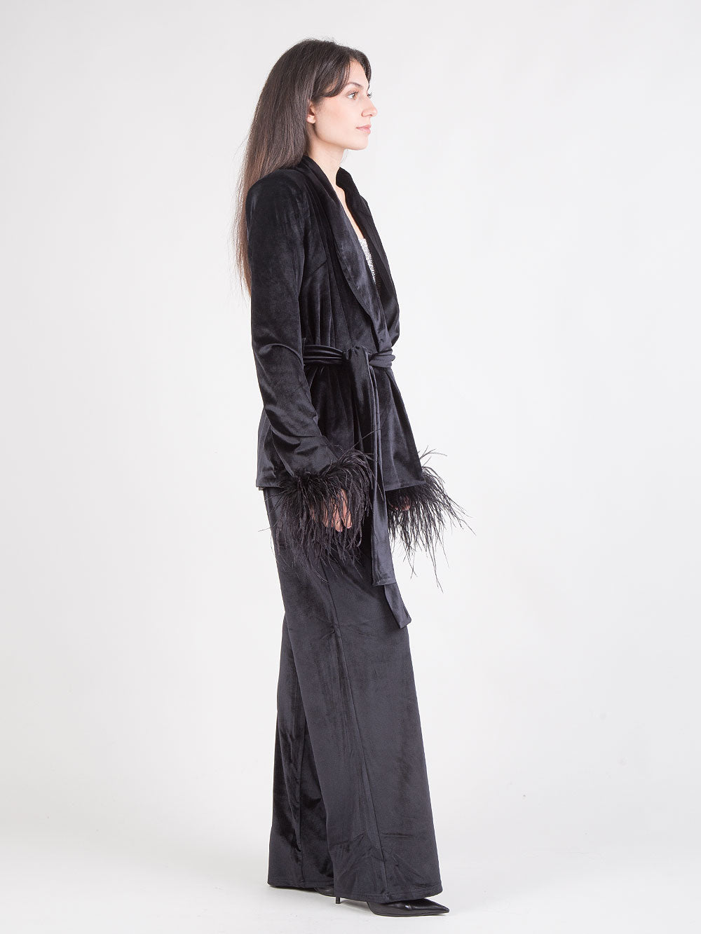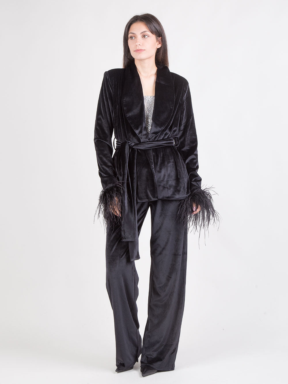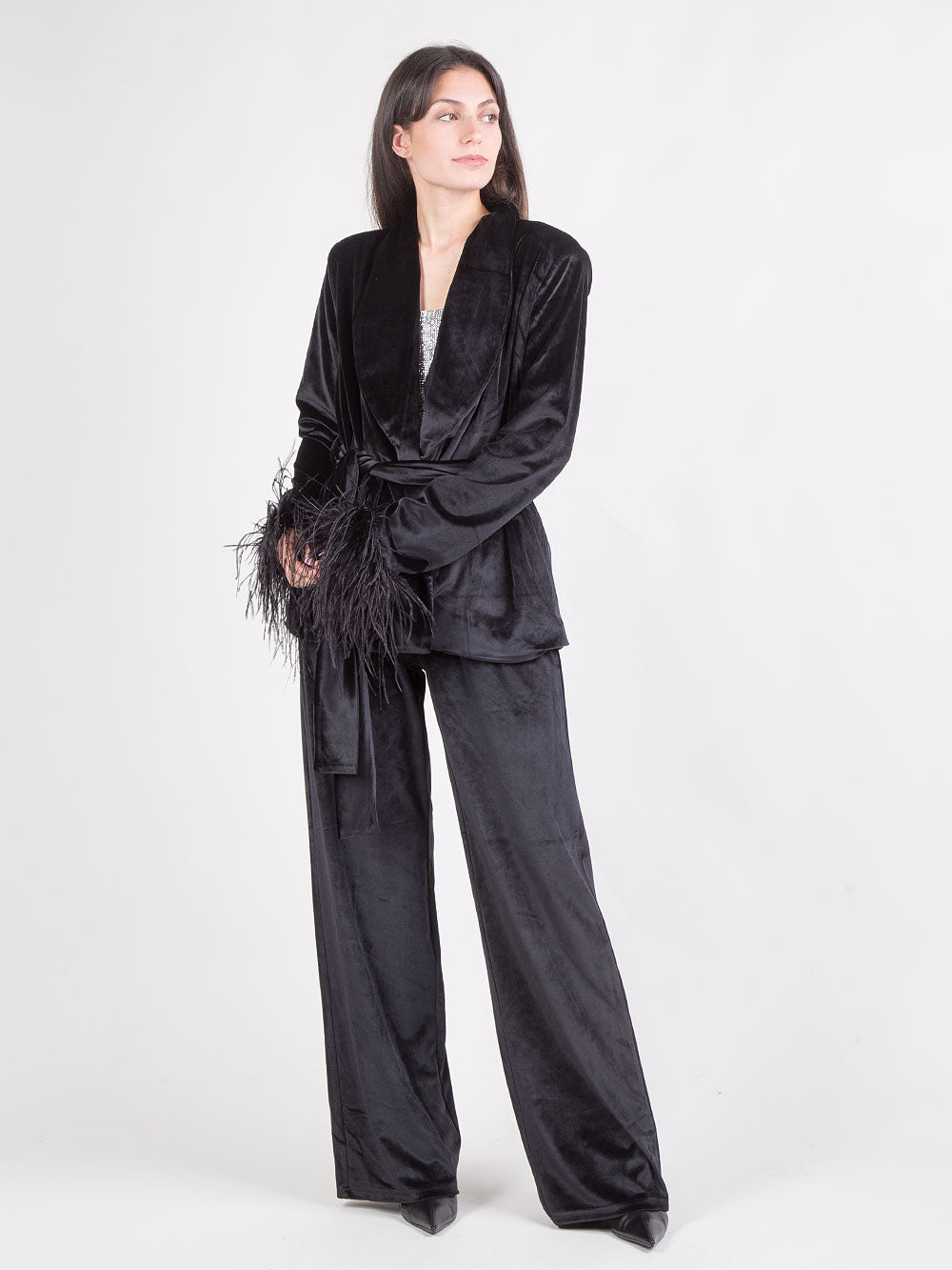 Completo in velluto nero composto da pantaloni e giacca coordinati. La giacca, morbida e con lunghezza che arriva al bacino, è caratterizzata da un rever sciallato e da una cintura in vita che mette in risalto la forma. Le maniche sono impreziosite da piume applicate sui polsi, un elemento scenografico che aggiunge movimento e personalità. I pantaloni presentano una linea dritta e una comoda vita elasticizzata, offrendo un look elegante ma rilassato.
