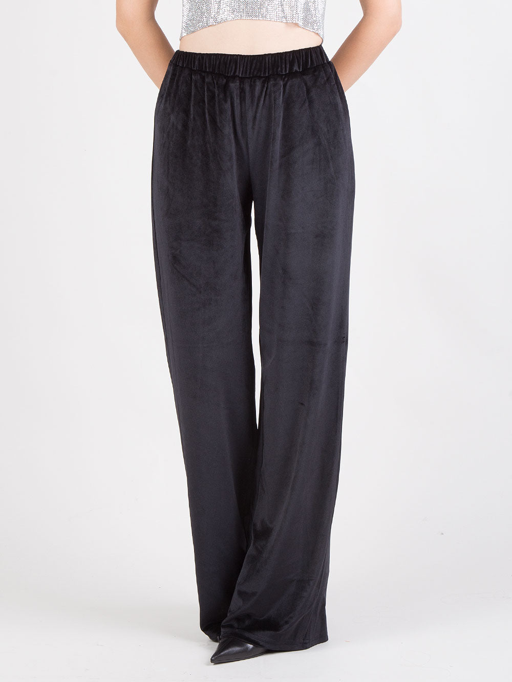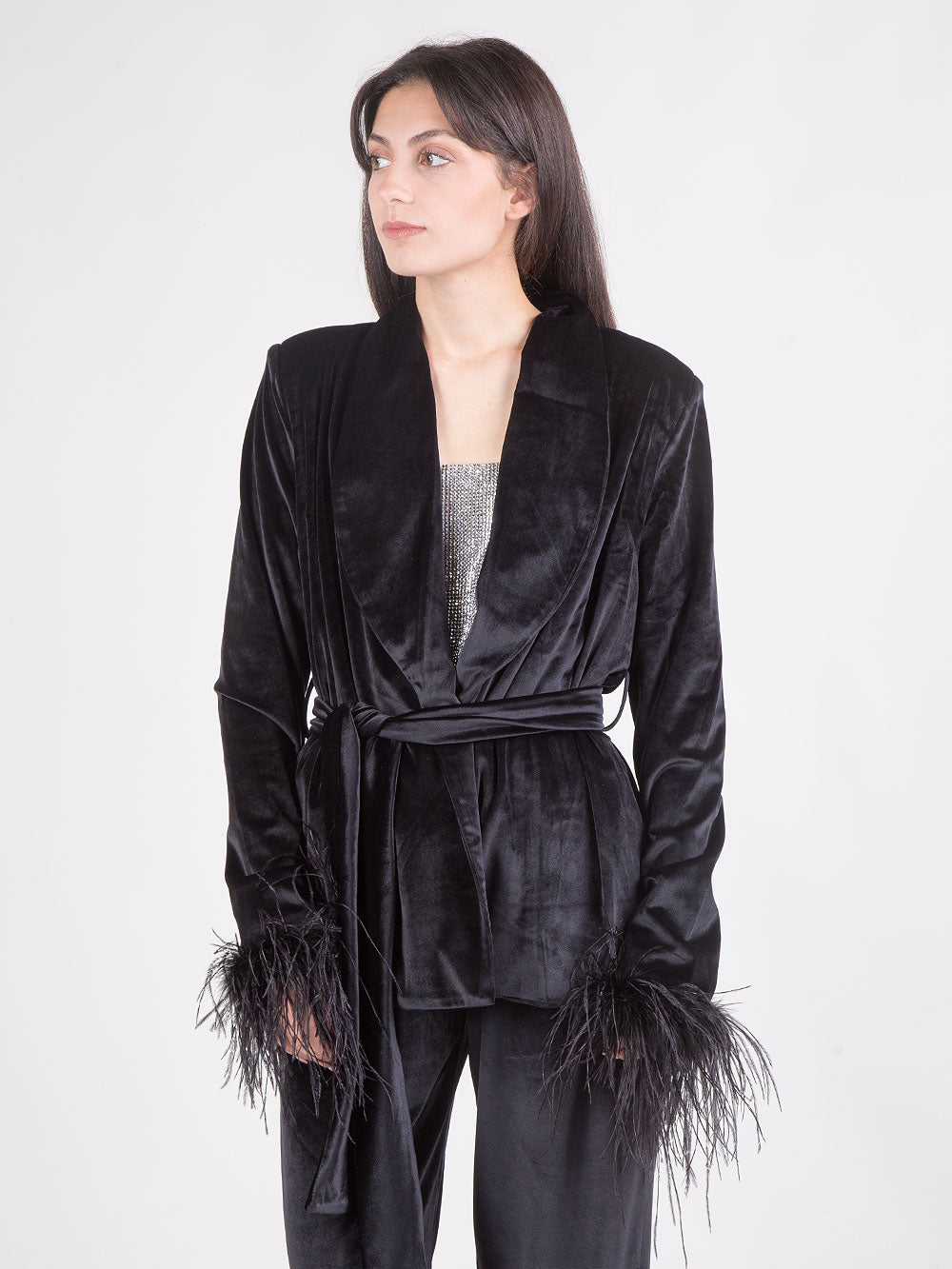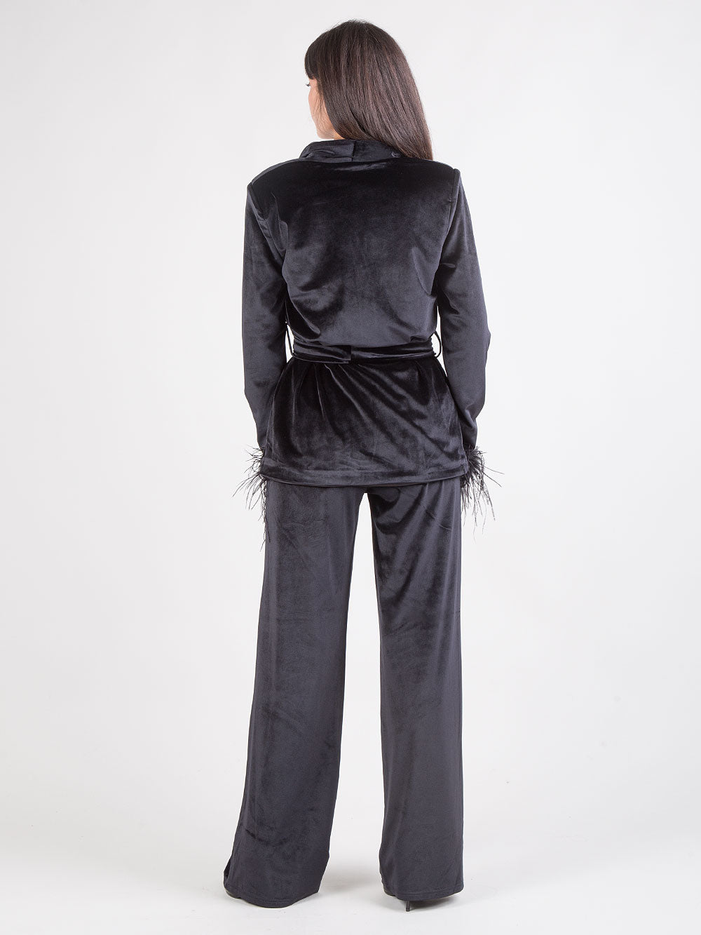 Completo in velluto nero composto da pantaloni e giacca coordinati. La giacca, morbida e con lunghezza che arriva al bacino, è caratterizzata da un rever sciallato e da una cintura in vita che mette in risalto la forma. Le maniche sono impreziosite da piume applicate sui polsi, un elemento scenografico che aggiunge movimento e personalità. I pantaloni presentano una linea dritta e una comoda vita elasticizzata, offrendo un look elegante ma rilassato.