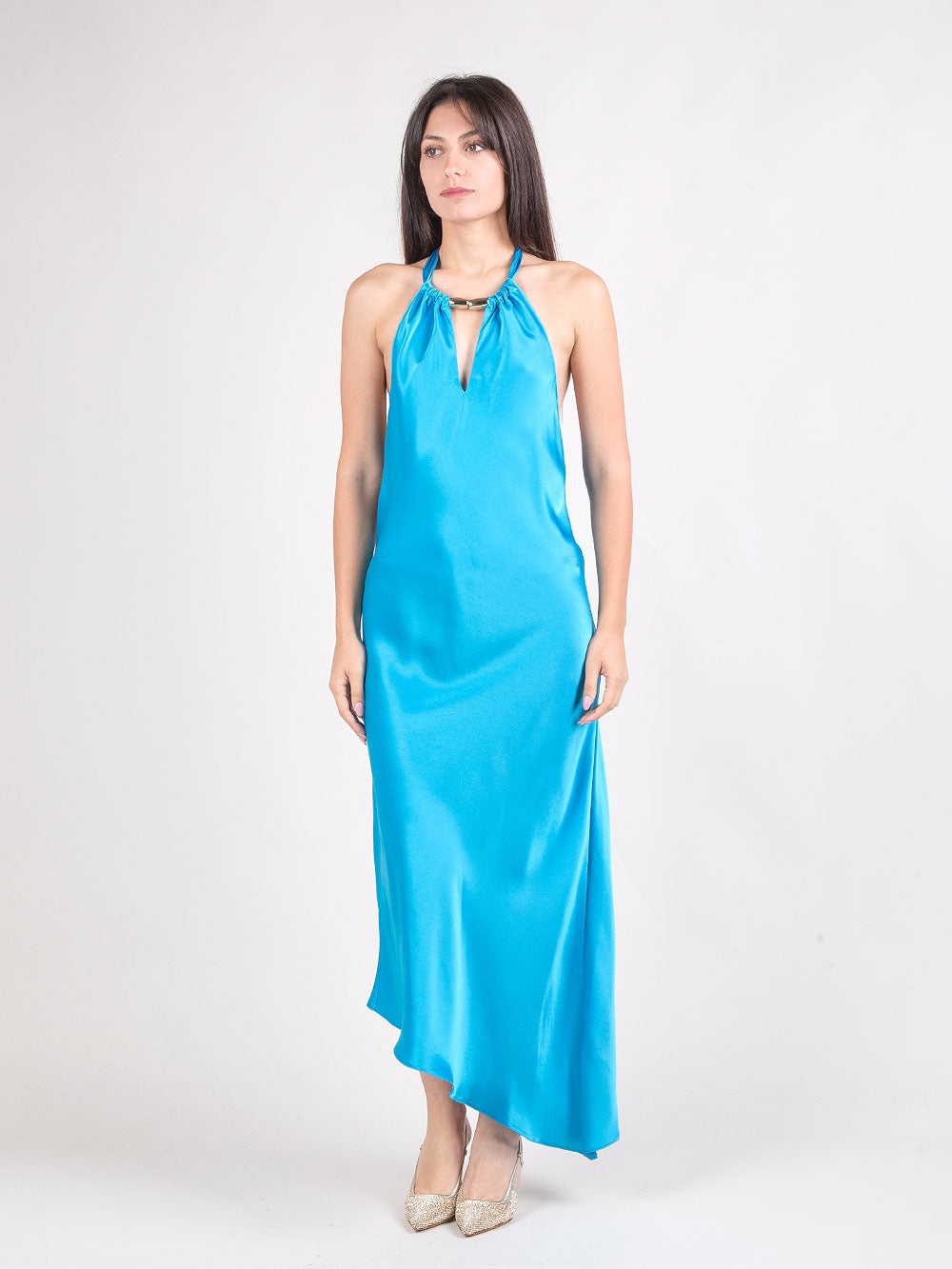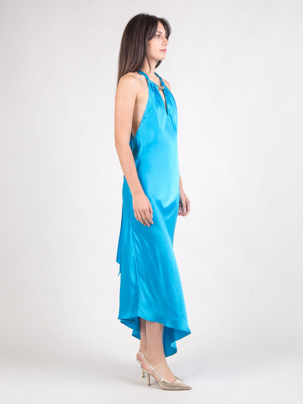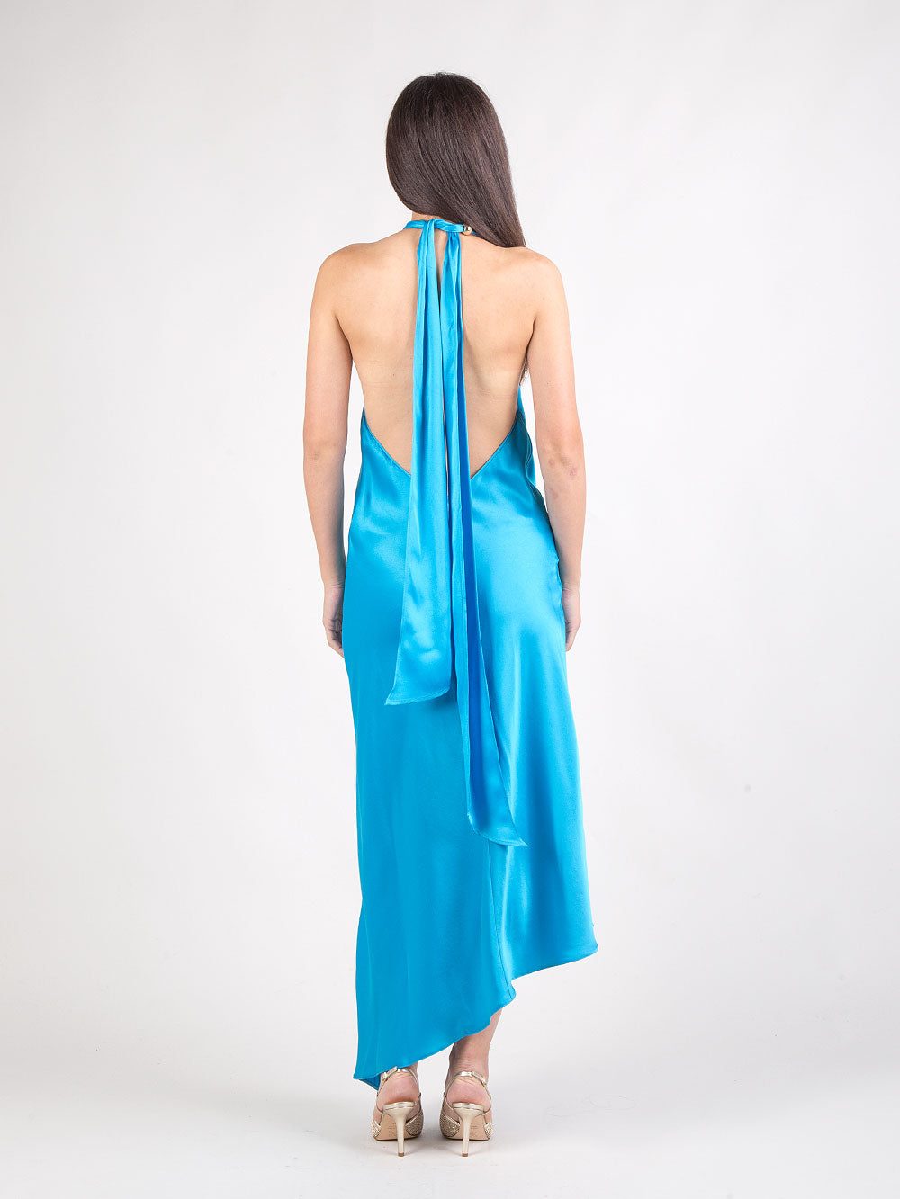• Dettagli: schiena scoperta con drappo legato al collo, orlo asimmetrico