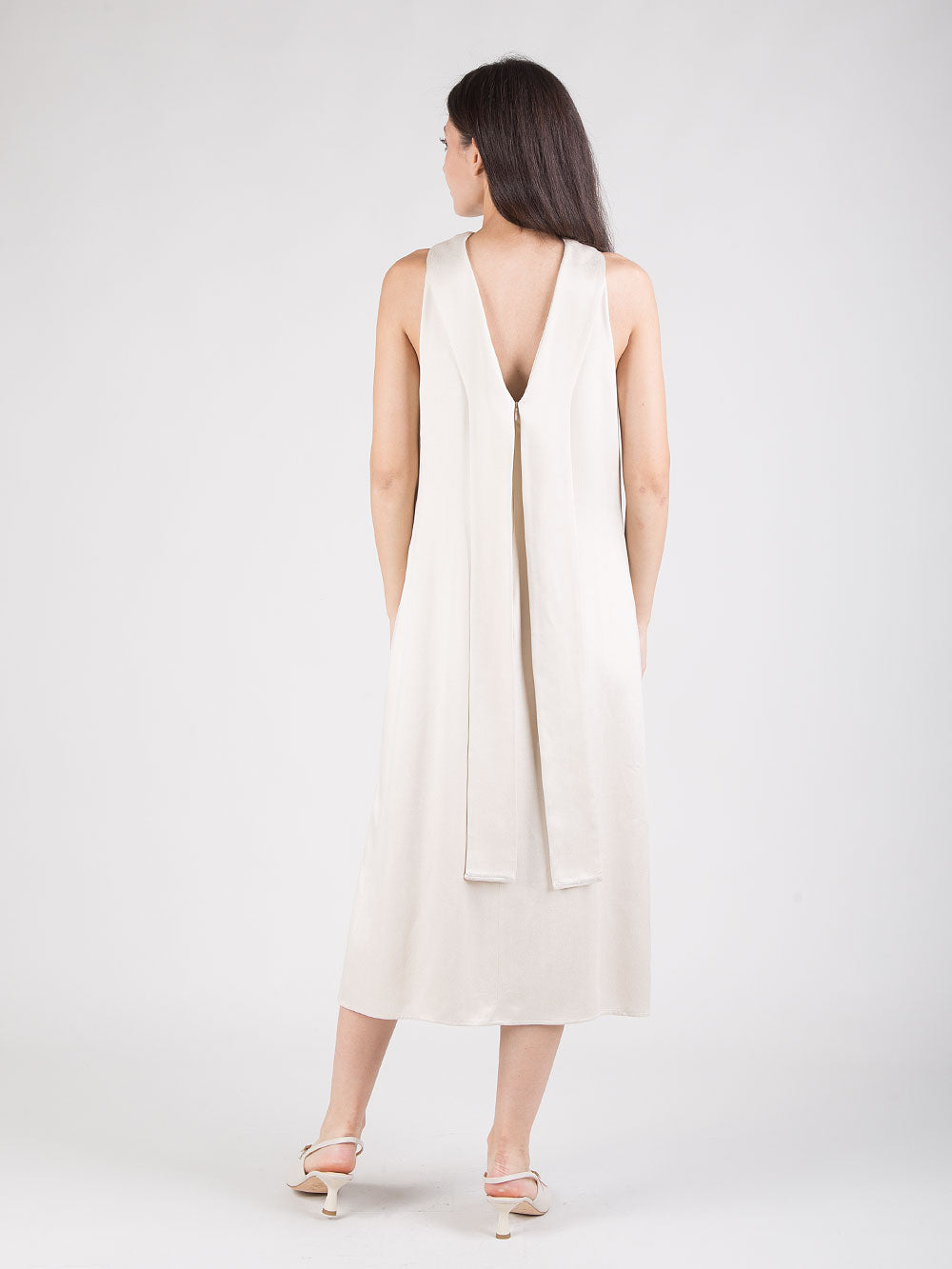 Un modello raffinato che unisce eleganza e modernità. Lo scollo all’americana è impreziosito da un collo a sciarpa con lunghe fusciacche che scendono morbidamente sul retro, regalando un movimento fluido e sofisticato. La profonda scollatura a V sulla schiena dona un tocco di sensualità discreta, perfettamente bilanciata dall’equilibrio delle linee. Realizzato in un tessuto leggero e confortevole in viscosa e cupro, questo abito midi si distingue per la sua vestibilità impeccabile e la cura sartoriale tipica di Peserico. Un capo ideale per cerimonie ed eventi serali, pensato per esaltare con naturalezza la femminilità.