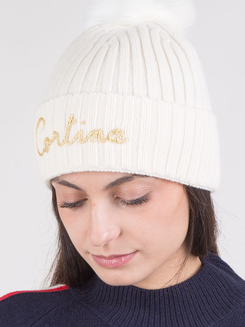 Il design a coste con risvolto è impreziosito dalla scritta ricamata “Cortina” sul davanti, un omaggio iconico alla località simbolo dell’eleganza alpina. Il pon pon bianco on top completa il look con un tocco femminile e raffinato, rendendo questo cappello perfetto sia per la città che per l’après-ski.