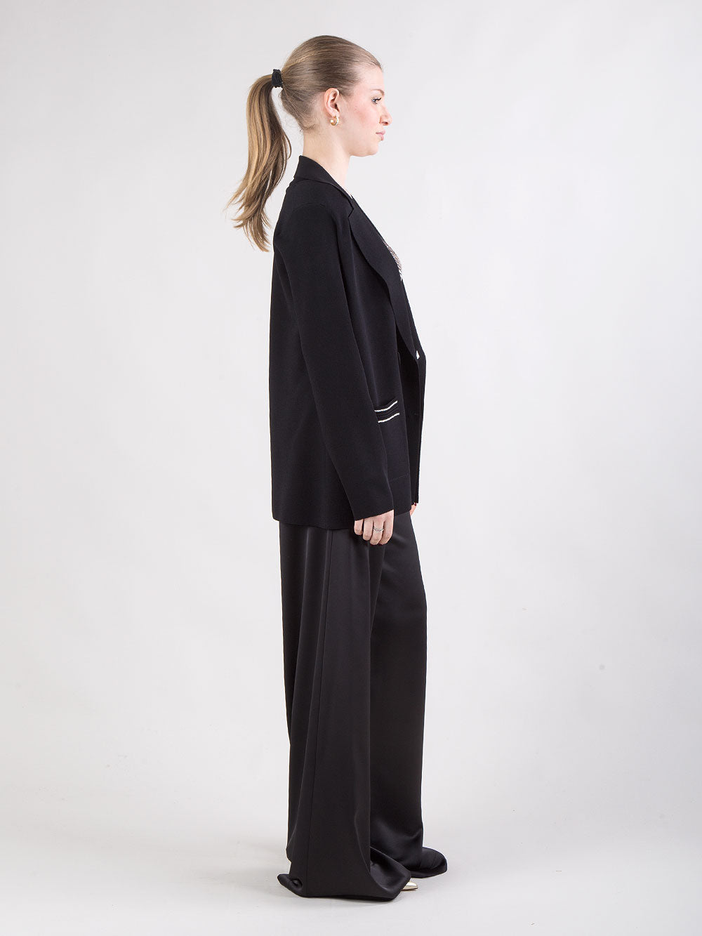 Giacca doppiopetto in maglia nera con dettaglio catenella
