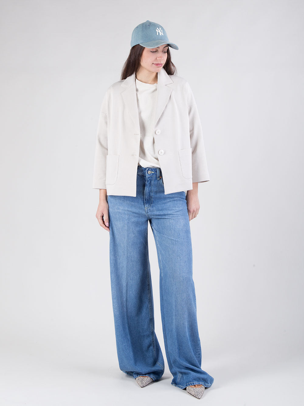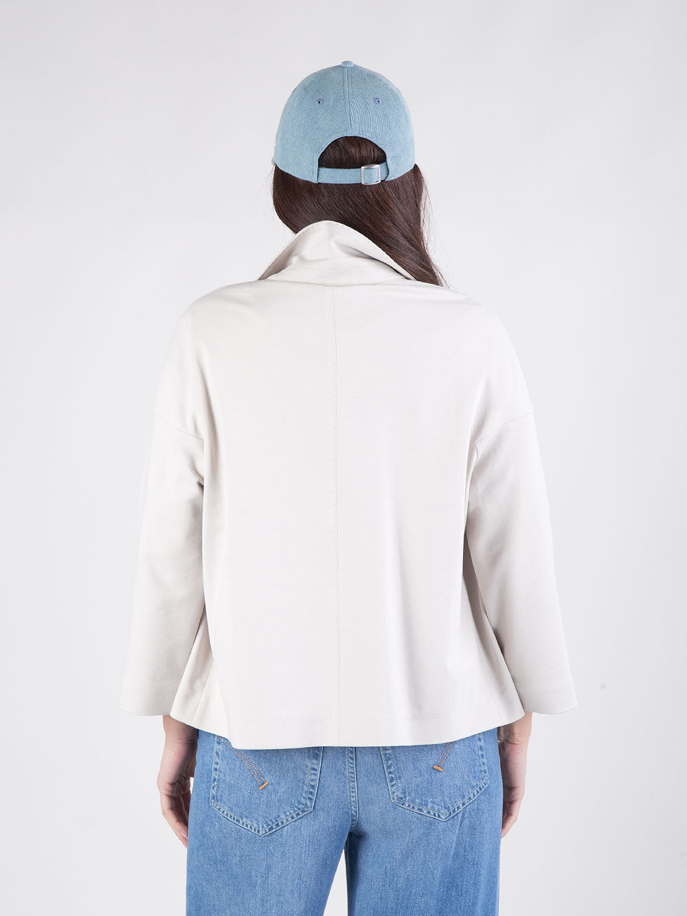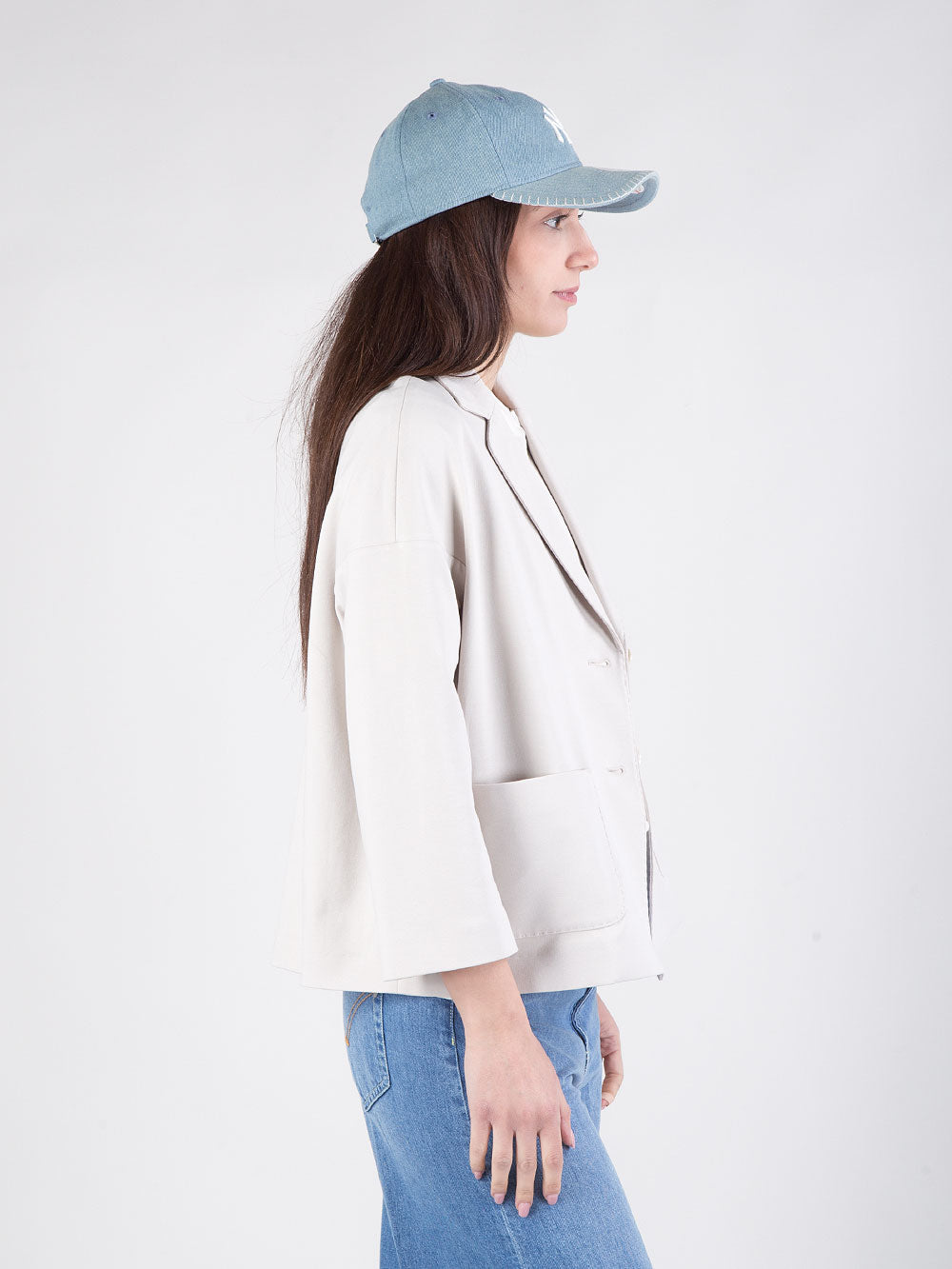 Il modello presenta chiusura con due bottoni e tasca a toppa, per un dettaglio discreto ma raffinato. Il color gesso aggiunge calore e versatilità, rendendo la giacca facile da abbinare a pantaloni, gonne o jeans, adattandosi perfettamente a molteplici occasioni.