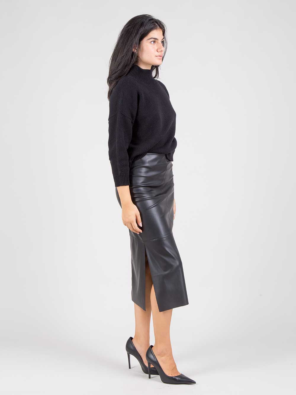 La gonna longuette Echo di Eufonia è un modello a tubino in morbida ecopelle, pensata per valorizzare la silhouette femminile con eleganza e carattere. Il design essenziale è arricchito da un raffinato spacco laterale, che dona movimento e femminilità senza rinunciare alla comodità. Realizzata in ecopelle di alta qualità, la gonna Echo è un capo versatile, perfetto da indossare sia in ufficio con una camicia e un blazer, sia per la sera con un top sofisticato e décolleté.