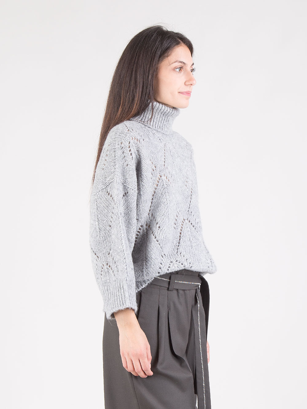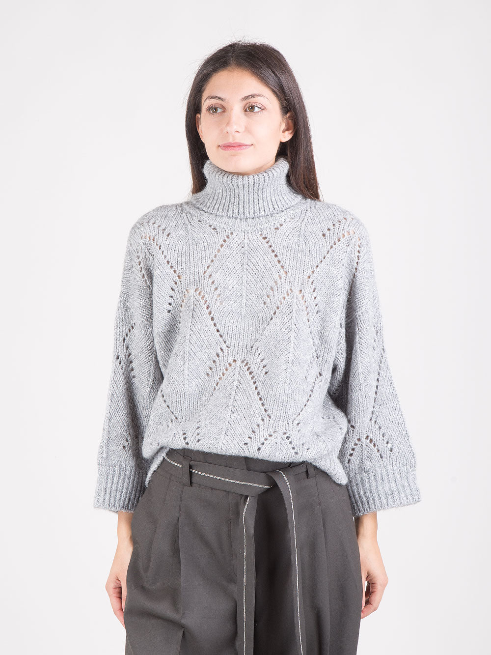 Un capo che esprime al meglio l’eleganza della lavorazione artigianale. Questa maglia a collo alto si distingue per il raffinato punto foglia: un disegno geometrico a trama traforata che richiama la forma stilizzata di foglie, creando una superficie ricca di movimento e profondità.