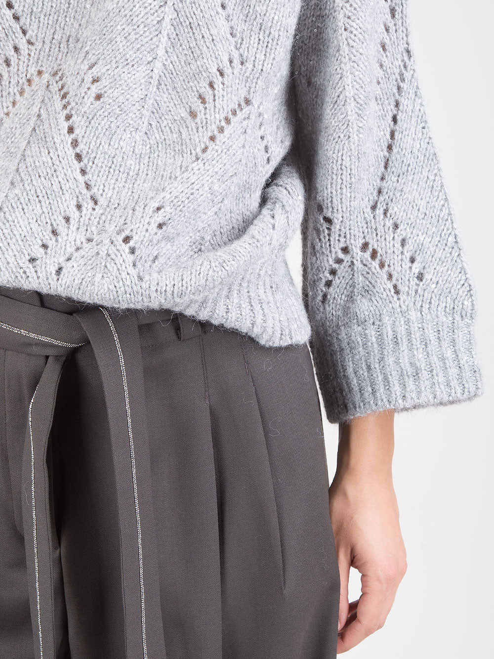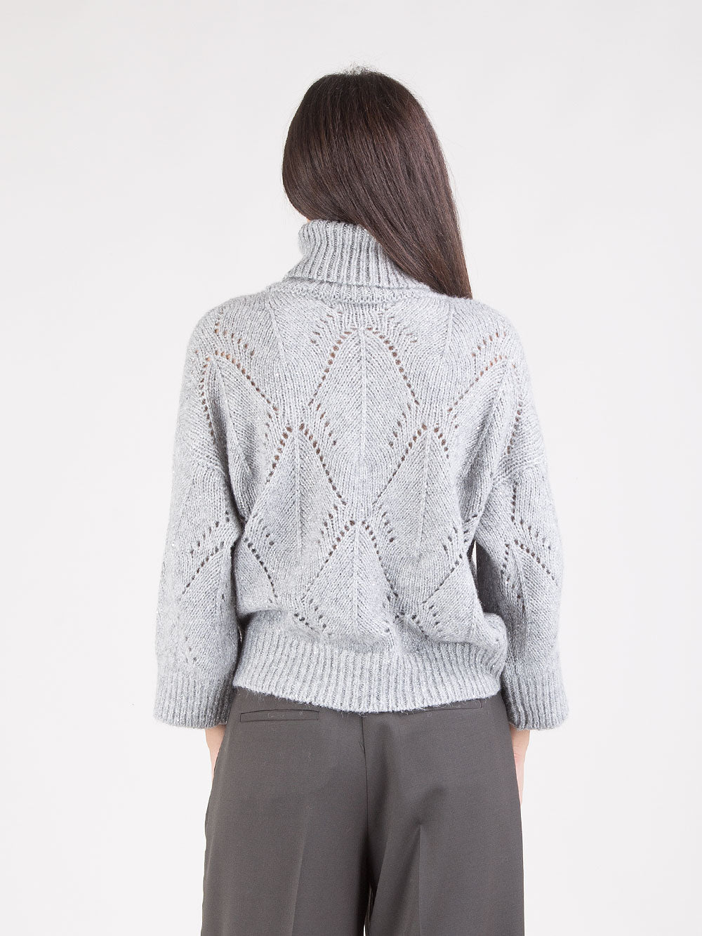 Il modello è completato da collo alto, polsi e cannolè a costine, che aggiungono struttura e definizione alla linea morbida e femminile. Proposta nella tonalità grigio sale d’argento, interpreta una raffinatezza contemporanea, perfetta per look versatili e sofisticati.