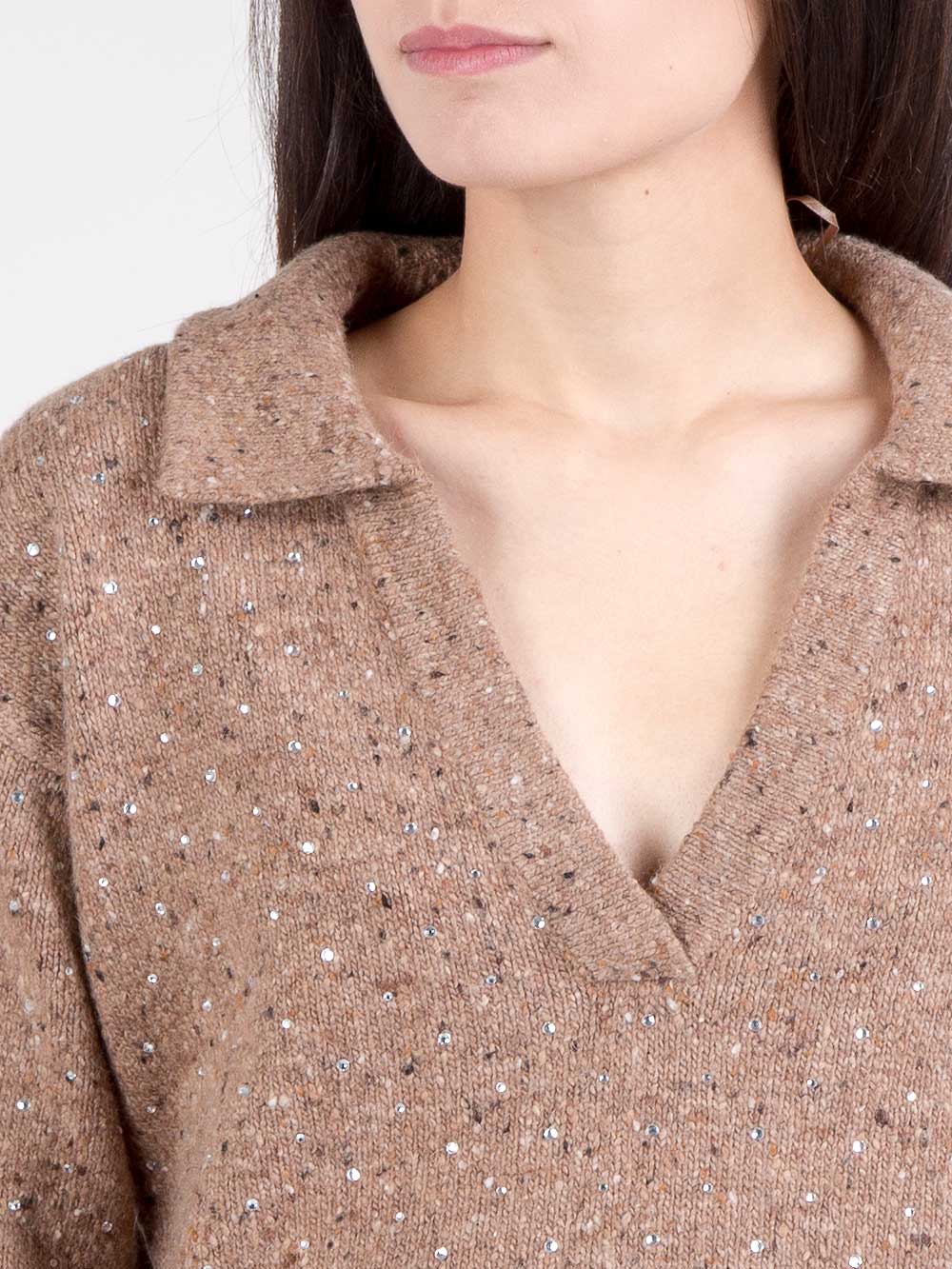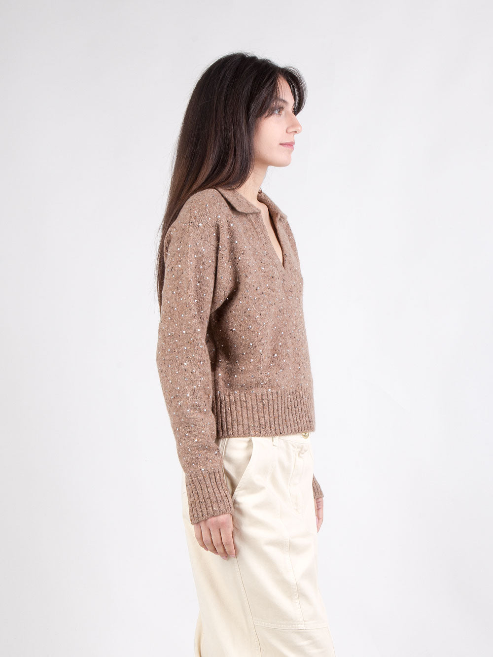 Realizzato in morbido tessuto bouclé bottonato, questo maglione con colletto stile polo e scollo a V si distingue per la sua texture preziosa, impreziosita da una pioggia di strass luminosi che donano eleganza e femminilità.