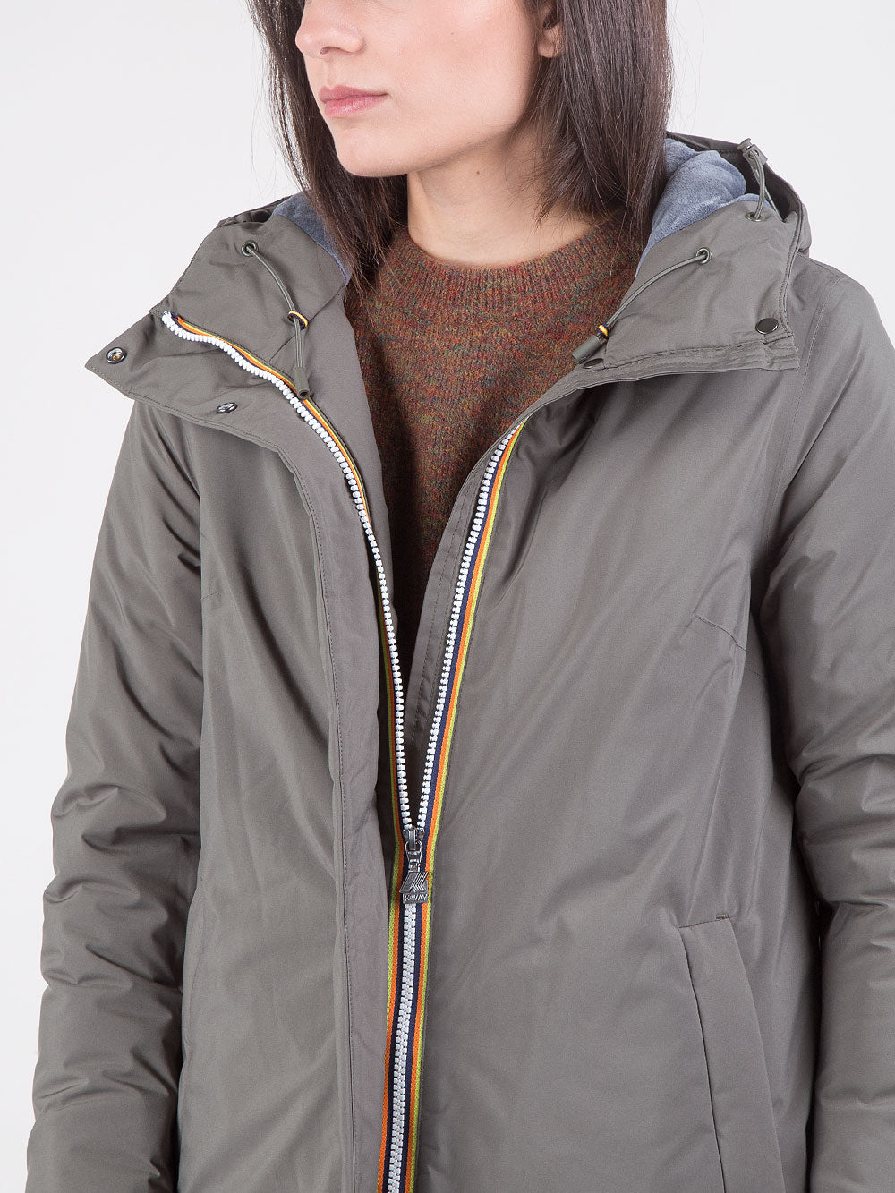 La giacca da donna K-WAY Sophie Soft Touch Marmotta nella versione verde con interno blu unisce funzionalità tecnica e stile urbano in un design contemporaneo e femminile. Il modello, di media lunghezza e linea slim, è ideale per la mezza stagione grazie al suo grado di calore medio e alla costruzione leggera ma protettiva.