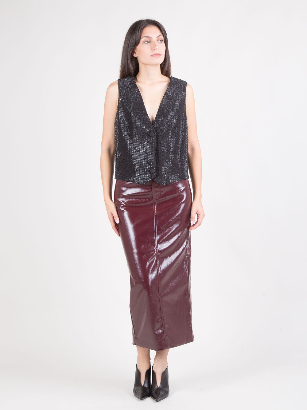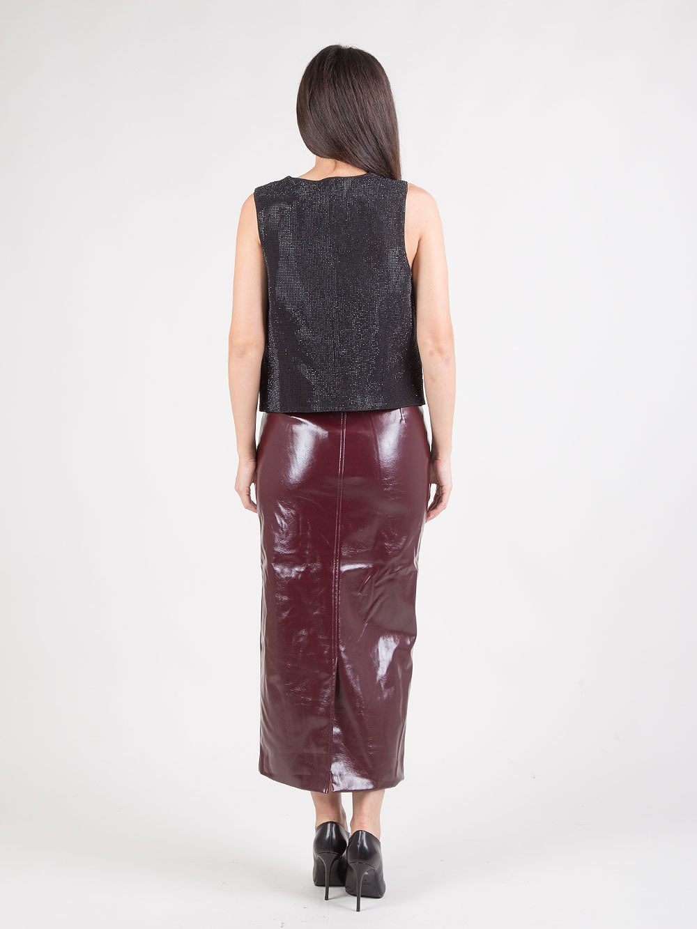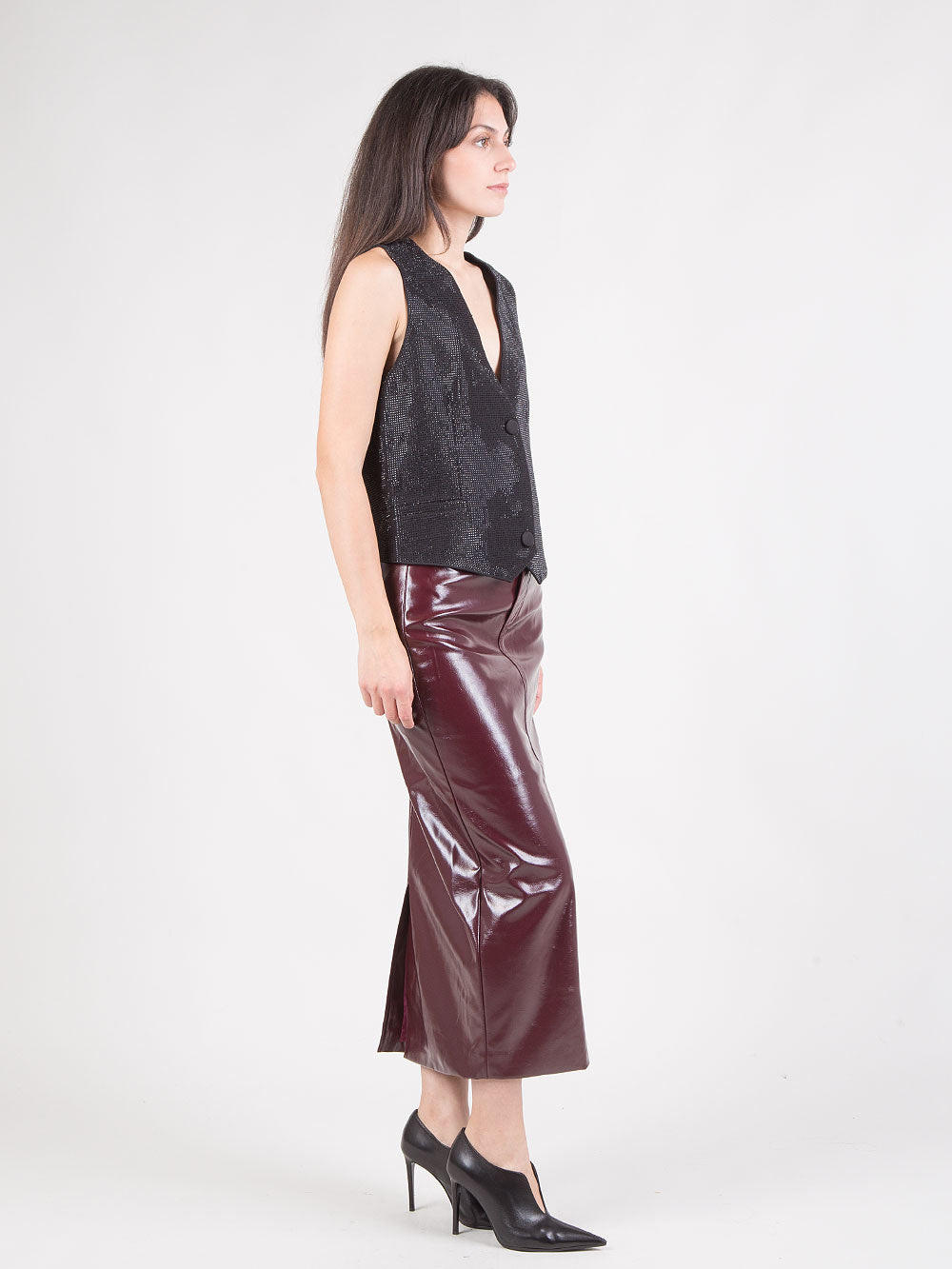 Gonna midi color prugna effetto pelle, caratterizzata da un bustino alto che definisce il punto vita e mette in risalto la figura. Lo spacco centrale sul retro dona movimento alla linea essenziale, mentre la chiusura laterale invisibile preserva un’estetica pulita. L’interno è rifinito con una fodera in satin, pensata per offrire comfort e una sensazione morbida sulla pelle.