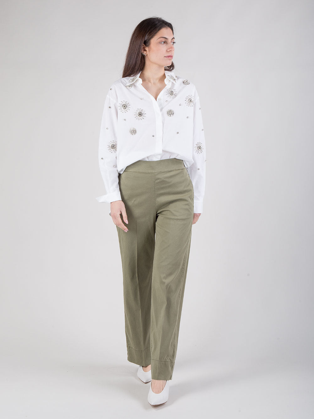 Il pantalone largo da donna Cigala’s è la scelta ideale per chi cerca comfort e stile Made in Italy. Realizzato in cotone elasticizzato morbido e resistente, è ulteriormente arricchito da un pratico elastico in vita nella parte posteriore che garantisce una vestibilità comoda e adattabile. Il design con ventre piatto e tasche a filo anteriori slancia la figura. Un pantalone versatile che si abbina facilmente a look casual quotidiani ma anche a proposte più raffinate.