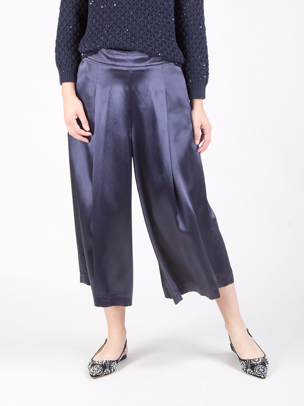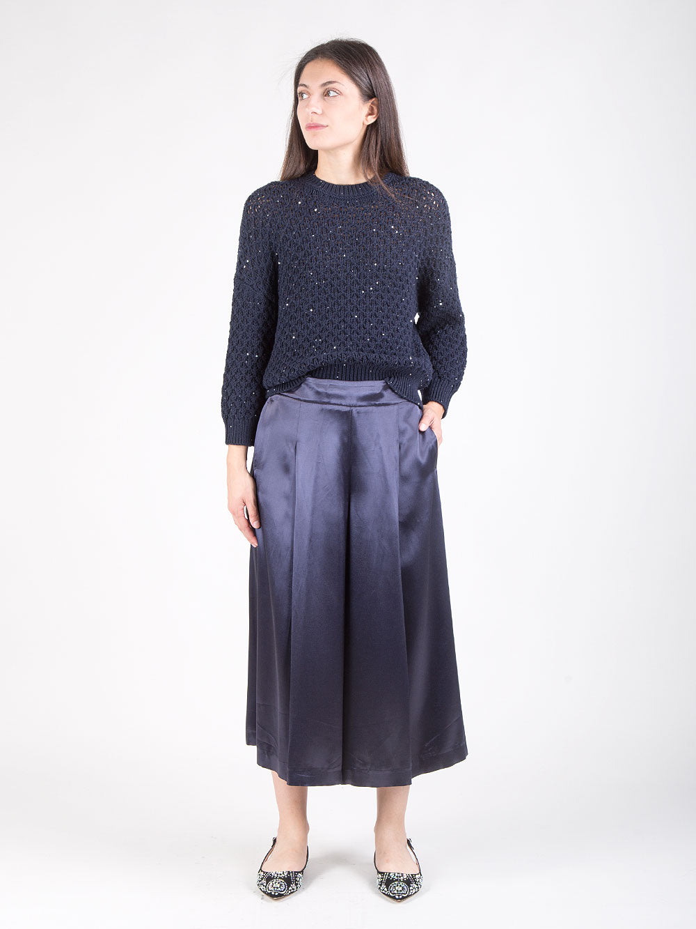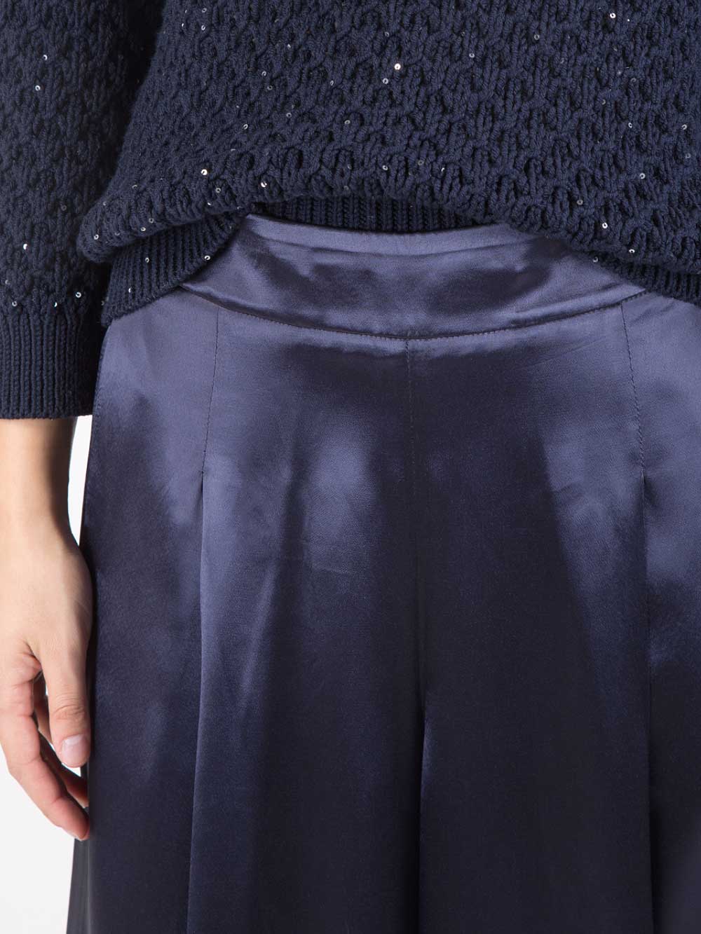 Un capo raffinato che unisce la fluidità del raso alla precisione sartoriale. Realizzata in raso di viscosa dall’effetto semi lucido, questa gonna pantalone si distingue per la vestibilità ampia e confortevole, resa ancora più elegante dalla costruzione con pince sartoriali che definiscono la silhouette.
