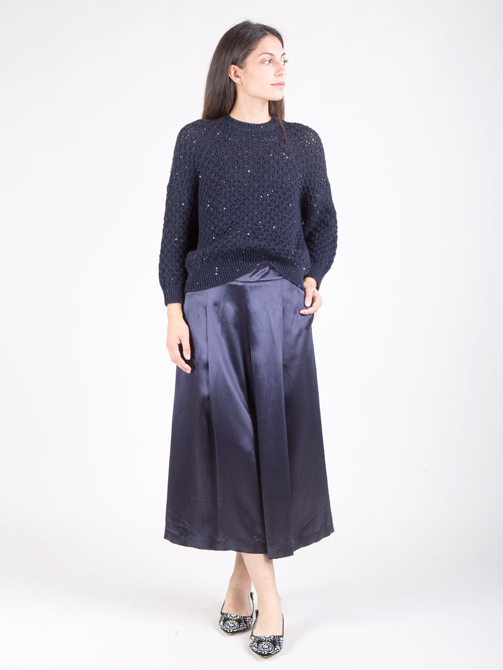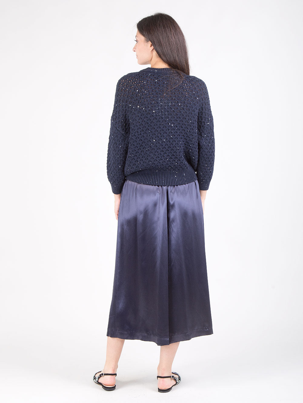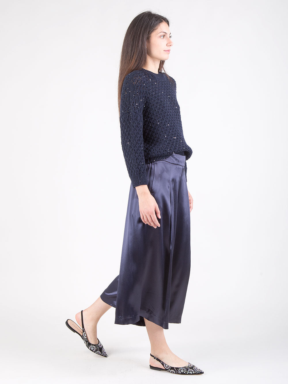 Un capo raffinato che unisce la fluidità del raso alla precisione sartoriale. Realizzata in raso di viscosa dall’effetto semi lucido, questa gonna pantalone si distingue per la vestibilità ampia e confortevole, resa ancora più elegante dalla costruzione con pince sartoriali che definiscono la silhouette.