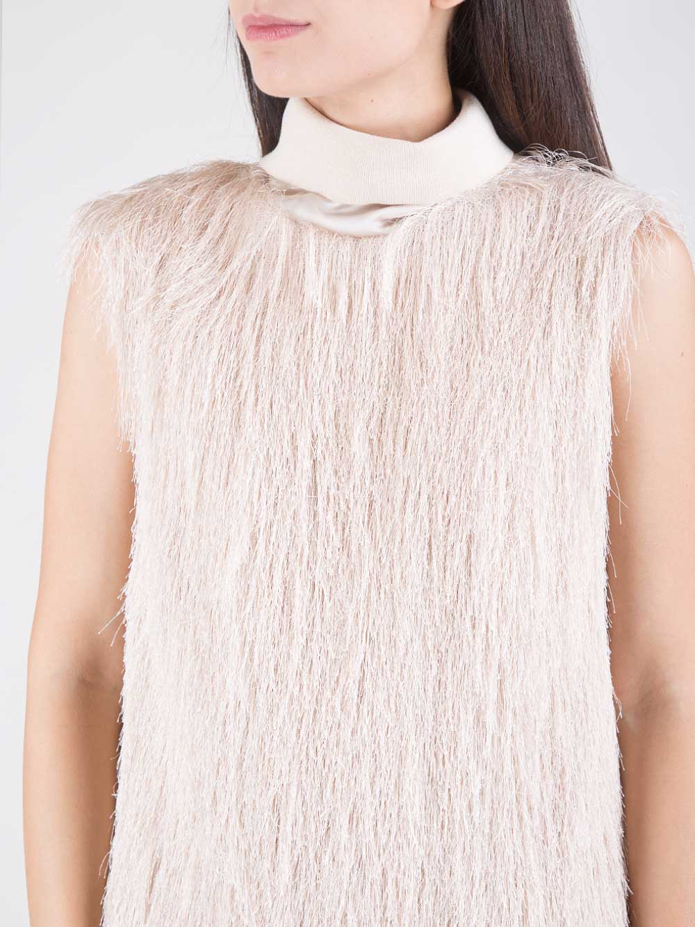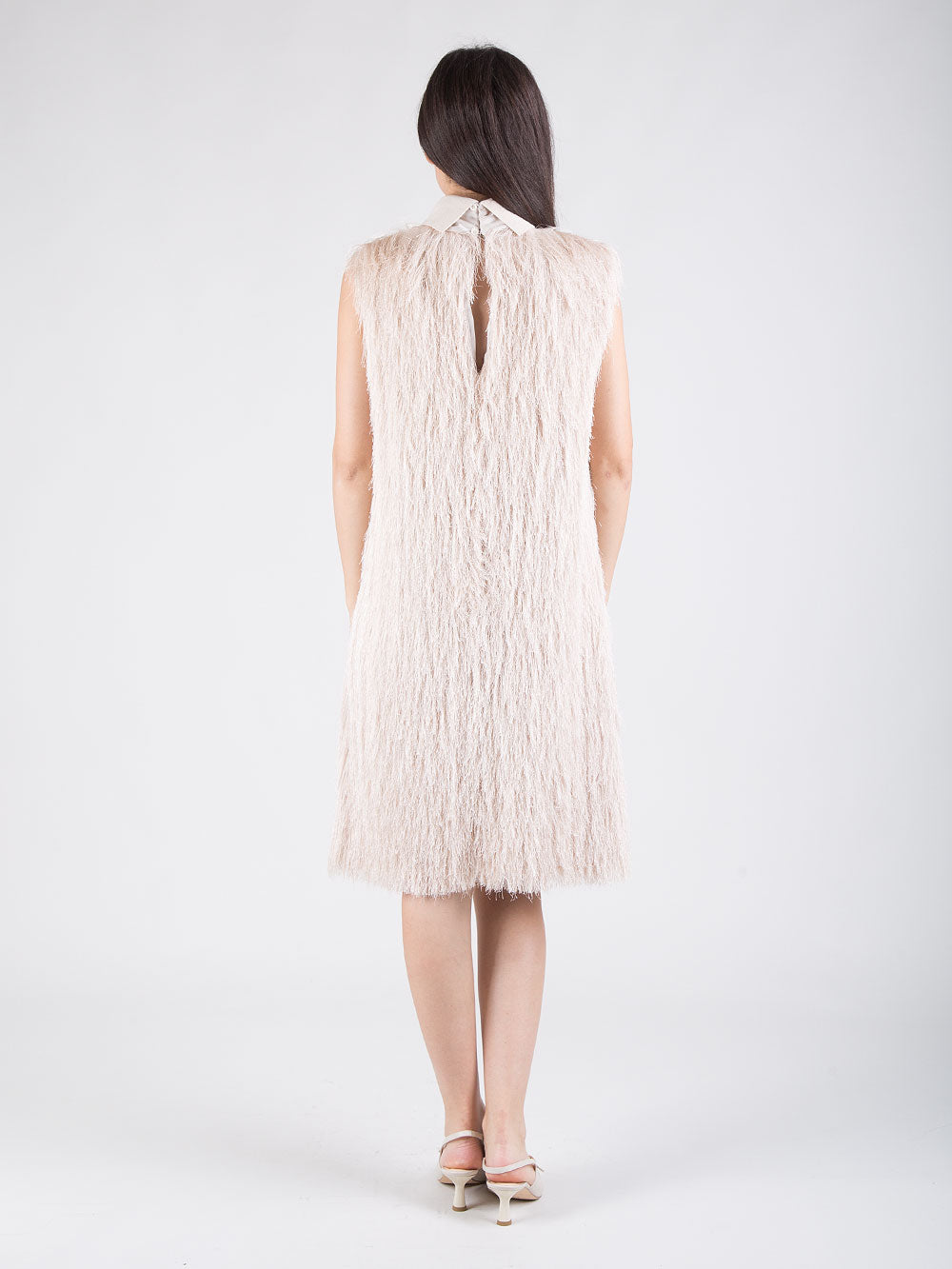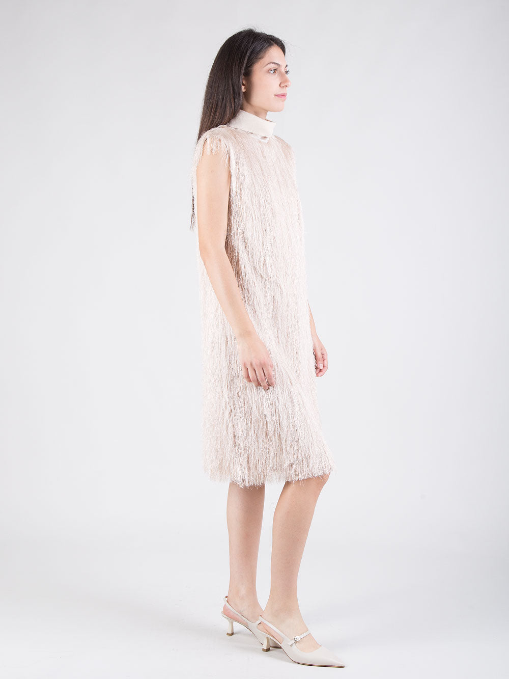 Un abito di grande impatto che unisce eleganza e modernità. Proposto nell’esclusiva tonalità amber beige, illumina la figura con sofisticata discrezione. La lavorazione a frangia in viscosa lurex, luminosa e leggera, è applicata su una base di jersey elasticizzato che assicura comfort e morbidezza. Il collo alto, chiuso sul retro da piccoli bottoncini, disegna un delicato dettaglio a goccia sulla schiena, aggiungendo un tocco sensuale e raffinato. La lunghezza longuette slancia la silhouette, mentre il movimento della frangia accompagna ogni passo con dinamismo e brillantezza, rendendo l’abito perfetto per eventi serali e occasioni speciali.