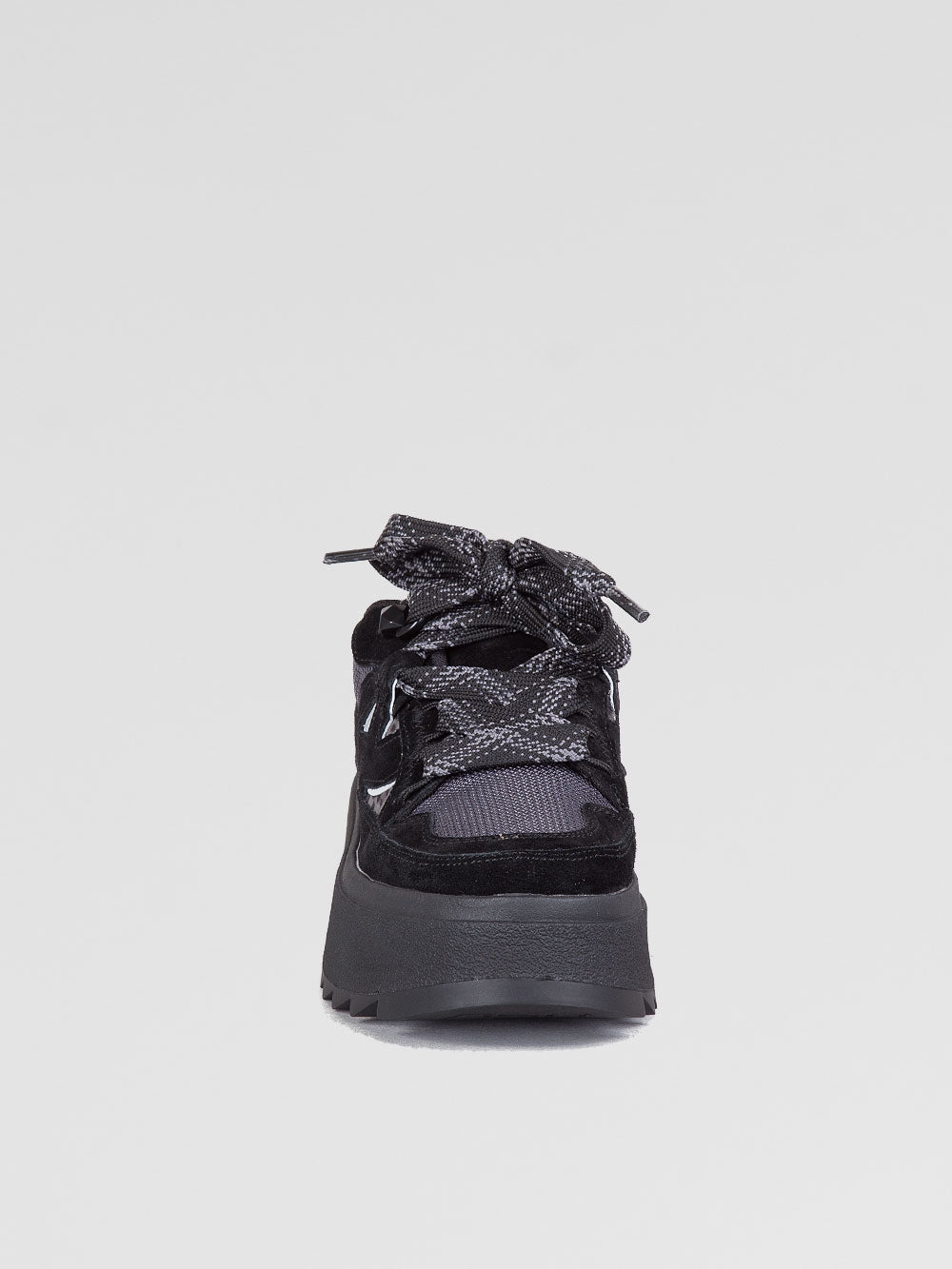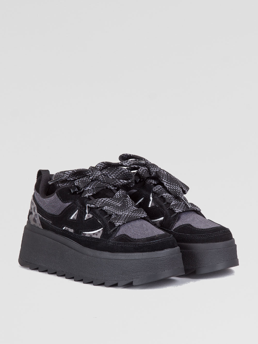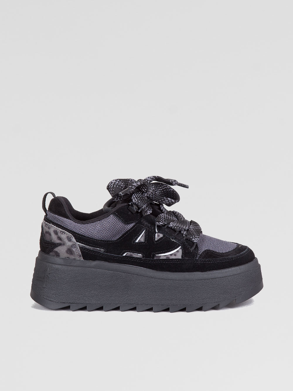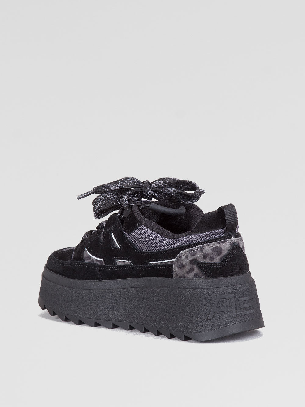 La maxi sneaker Ash Movie unisce design contemporaneo e dettagli ricercati, diventando un must-have per chi ama lo stile urbano di tendenza. La tomaia è realizzata con un mix di materiali pregiati come nappa, suede e micro rete, impreziosita da inserti animalier tono su tono che aggiungono carattere senza eccessi. La punta arrotondata e la chiusura con lacci spessi bicolore sottolineano il suo spirito sport-fashion. La maxi suola in gomma dentata, alta fino a 6 cm, garantisce comfort, stabilità e un tocco deciso ad ogni look.