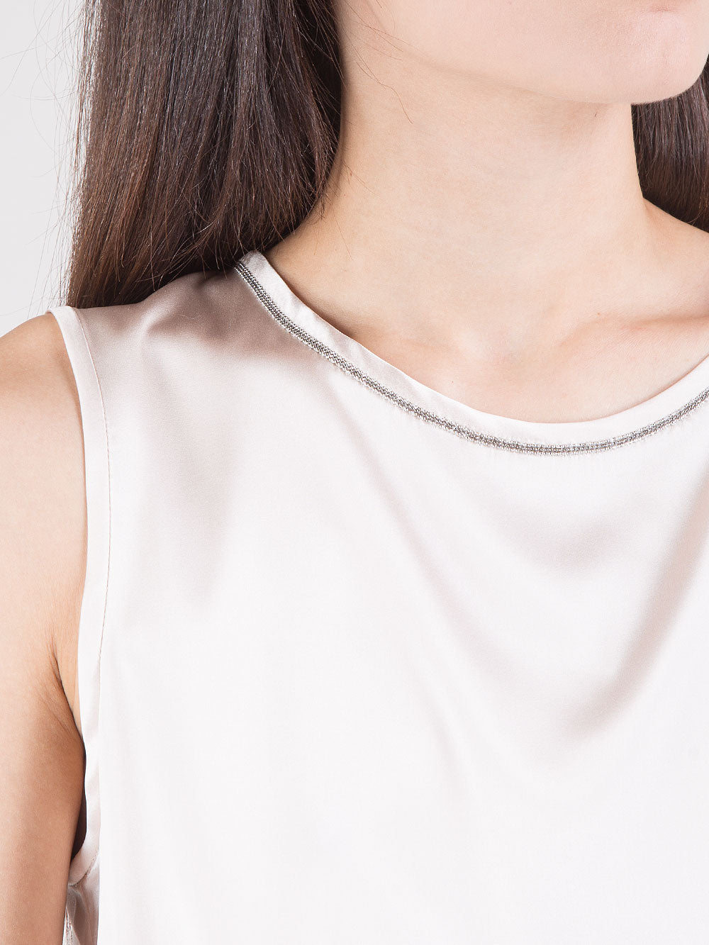 Un capo essenziale e raffinato che interpreta con eleganza la semplicità delle linee pulite. Realizzato in pregiato raso di seta stretch, regala una luminosità naturale e una piacevole sensazione sulla pelle. La scollatura a girocollo è impreziosita da un delicato punto luce che aggiunge un dettaglio discreto e sofisticato. Senza maniche e dalla linea minimal, questo top si distingue per la sua versatilità: perfetto sotto giacche e blazer per look da giorno, ma anche protagonista di abbinamenti serali grazie al suo fascino sobrio e ricercato.