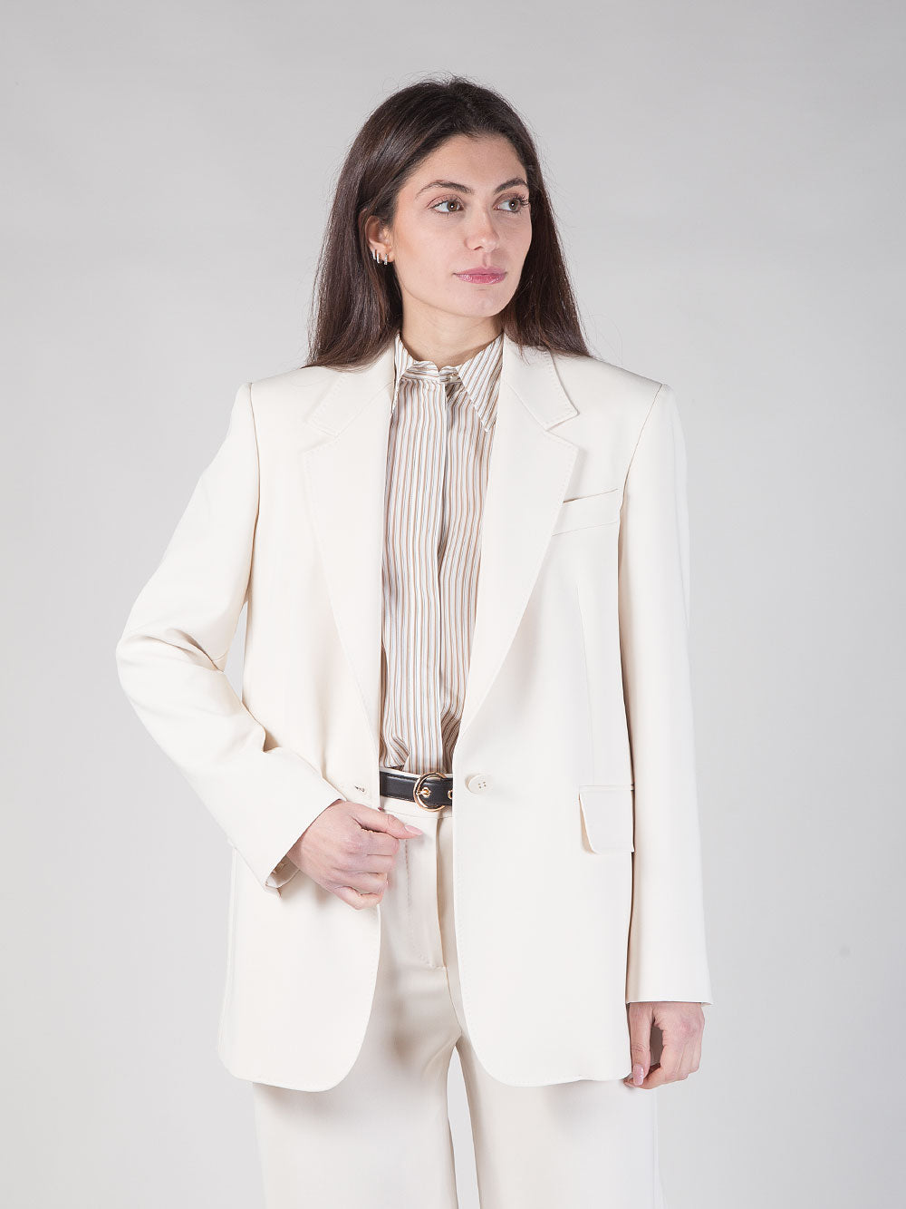 Dal gusto sartoriale e dalle linee contemporanee, questo blazer monopetto Max Mara Studio Primavera/Estate 2026 è realizzato in cady fluido e strutturato, ideale per valorizzare la silhouette con eleganza. Il taglio allungato è enfatizzato da impunture verticali sui fianchi che slanciano la figura, creando un effetto raffinato e moderno.