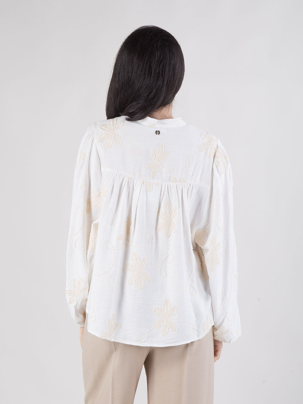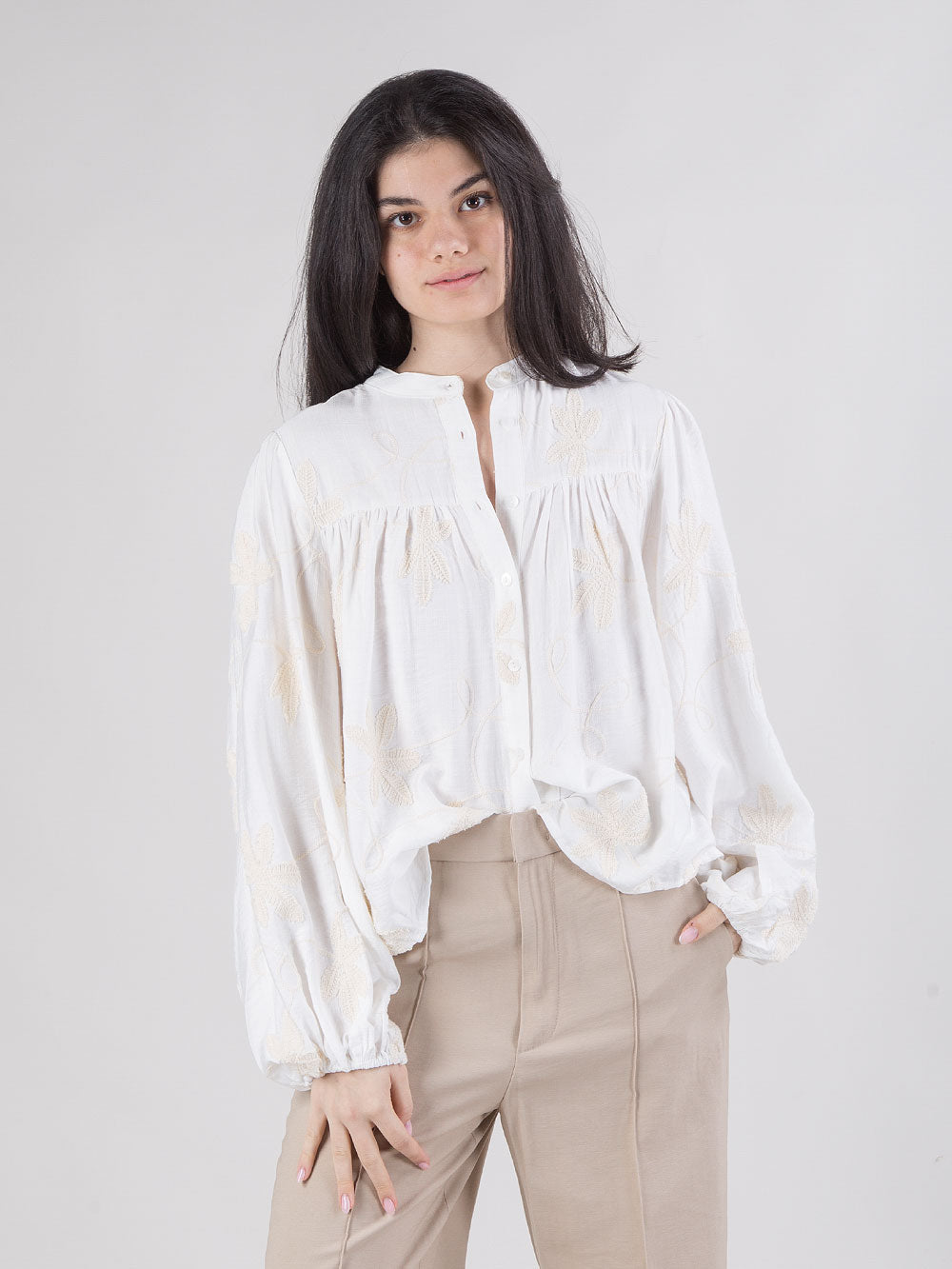 Blusa dal gusto romantico e femminile, caratterizzata da una stampa floreale a rilievo ricamata che dona texture e raffinatezza al capo. Il modello presenta collo alla coreana e abbottonatura frontale con bottoni, per un look elegante ma facile da indossare. Le maniche a palloncino con elastico al polso aggiungono volume e movimento, mentre la linea leggermente svasata sul fondo garantisce comfort e valorizza la silhouette. La vestibilità regolare la rende perfetta sia per outfit quotidiani che per abbinamenti più curati.