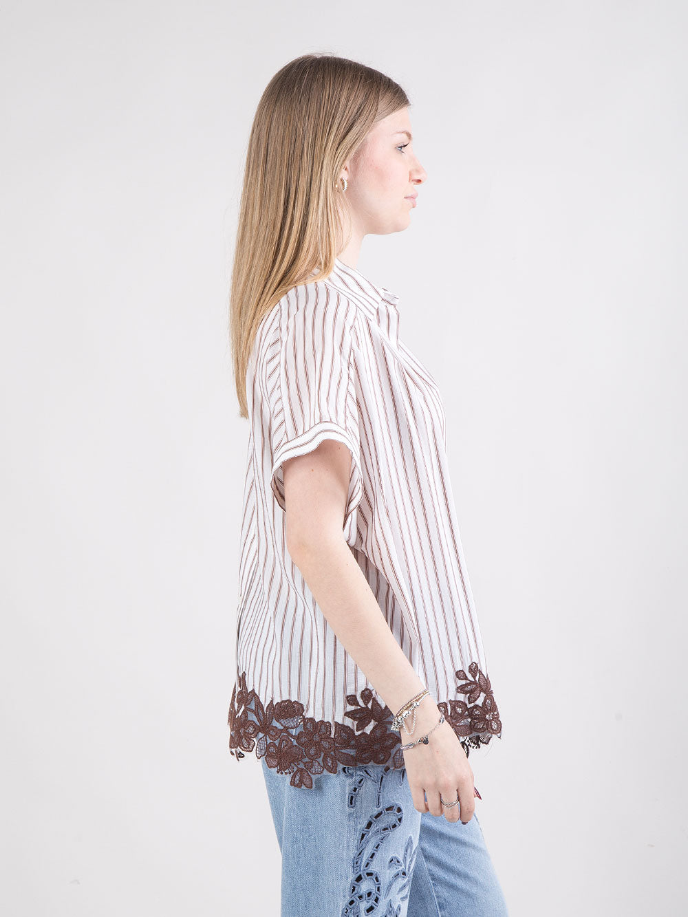 La camicia si distingue per una linea corta con manica scesa, realizzata in tessuto leggero a righe che dona freschezza e comfort. Il design è completato da un collo classico e da una abbottonatura frontale a scomparsa, che mantiene il look pulito ed essenziale. Il ricamo sul bordo aggiunge un dettaglio raffinato e delicato, mentre le pince posteriori sulla schiena valorizzano la vestibilità e la struttura del capo. Leggera e versatile, questa camicia è ideale per outfit eleganti e contemporanei della stagione Primavera/Estate.
