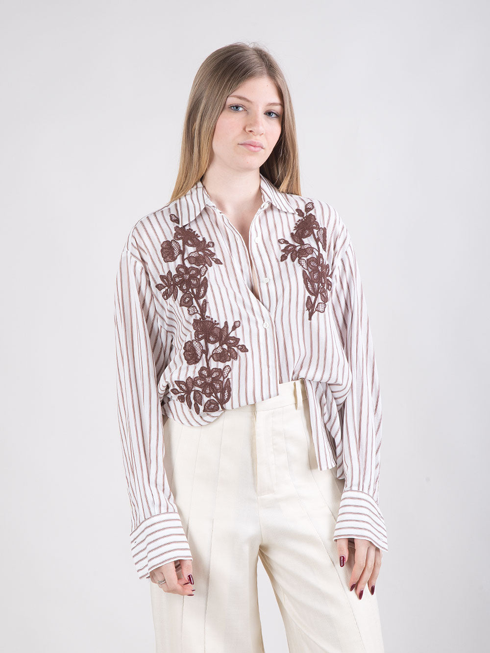 La camicia si distingue per una linea fluida e morbida dal taglio maschile leggermente oversize, pensata per offrire comfort e uno stile contemporaneo. Realizzata in viscosa leggera a righe, è impreziosita da delicati tralci ricamati sul davanti che aggiungono un tocco raffinato e femminile al design. Il volume rilassato e la leggerezza del tessuto rendono questo capo ideale per creare look eleganti ma disinvolti della stagione Primavera/Estate.