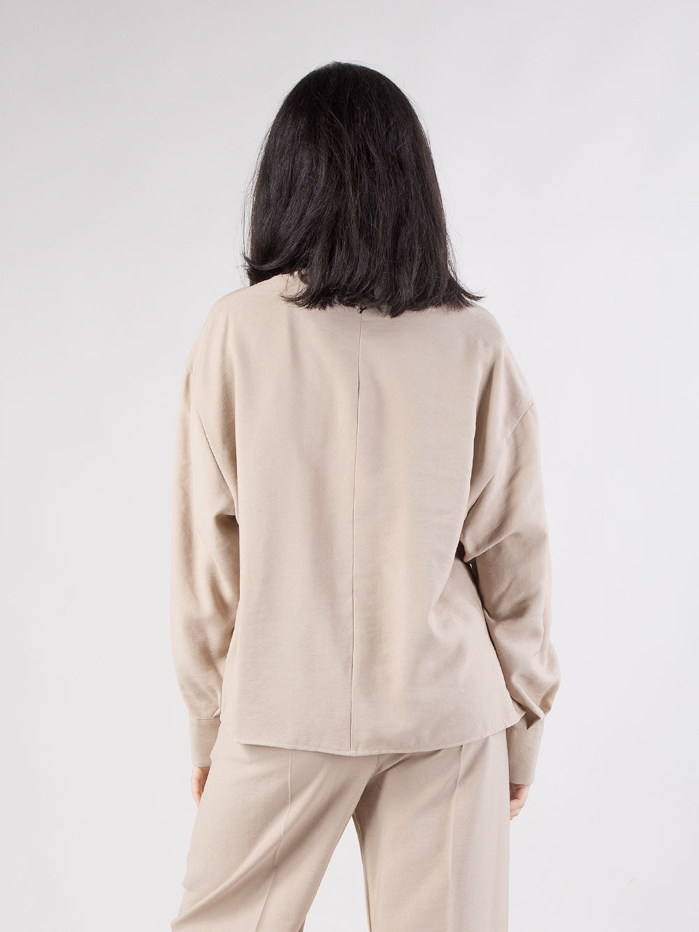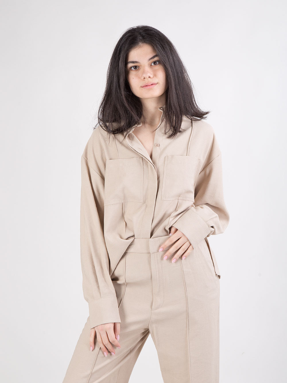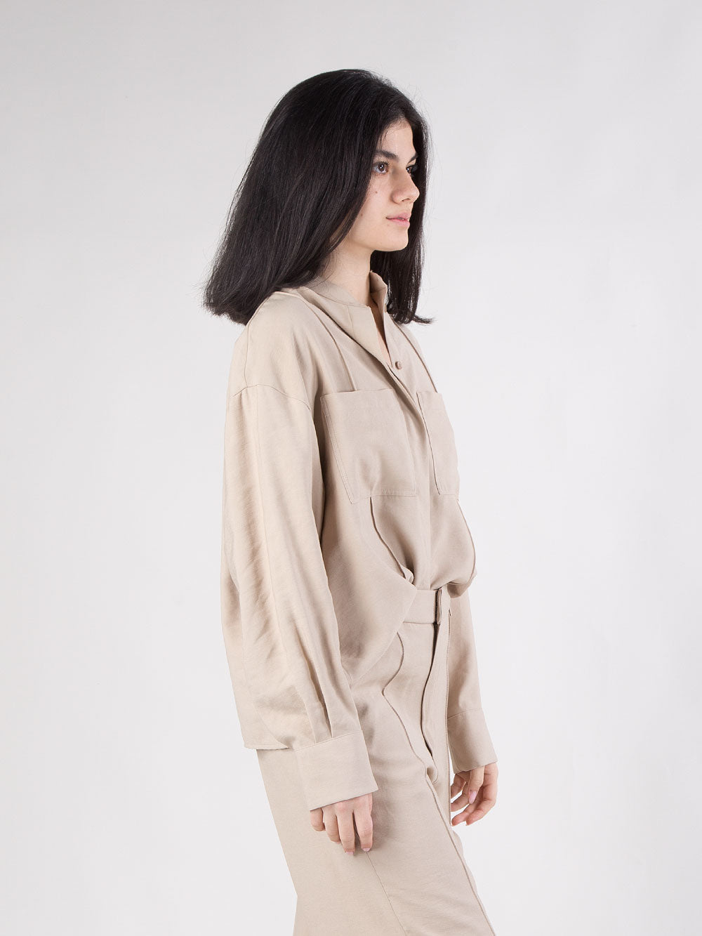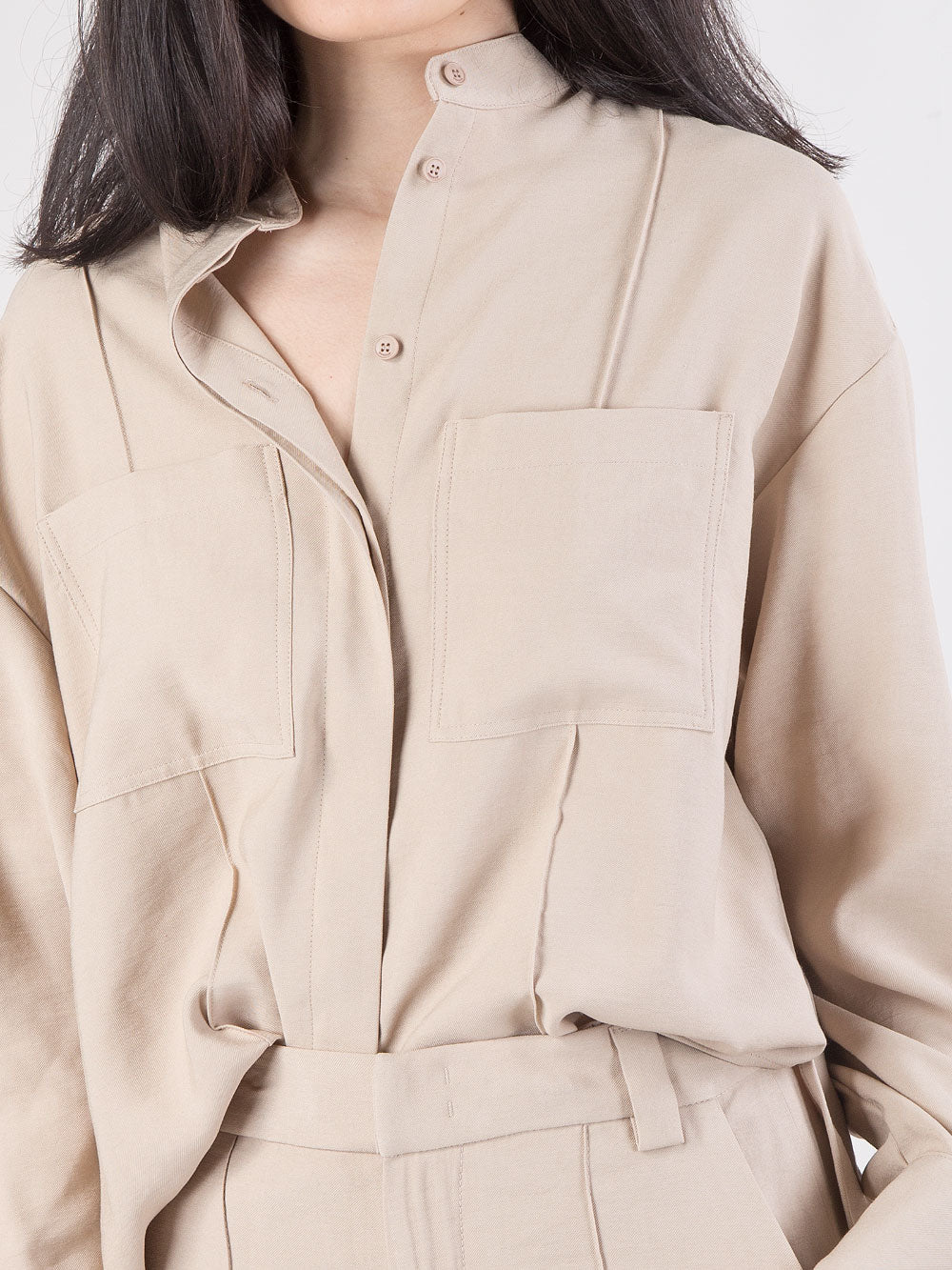 Camicia dal design contemporaneo e raffinato, caratterizzata da una vestibilità over che dona al capo un look rilassato e moderno. Il modello presenta collo alla coreana e abbottonatura frontale con bottoni a scomparsa, per una linea pulita ed essenziale. Le due tasche anteriori a toppa aggiungono un tocco utility, mentre le cuciture a rilievo sul davanti valorizzano la struttura del capo. Le maniche larghe con polsino alto definiscono un volume elegante, completato da due piccoli spacchi laterali che garantiscono comfort e movimento. Un capo versatile, perfetto per completare look minimal o più ricercati.