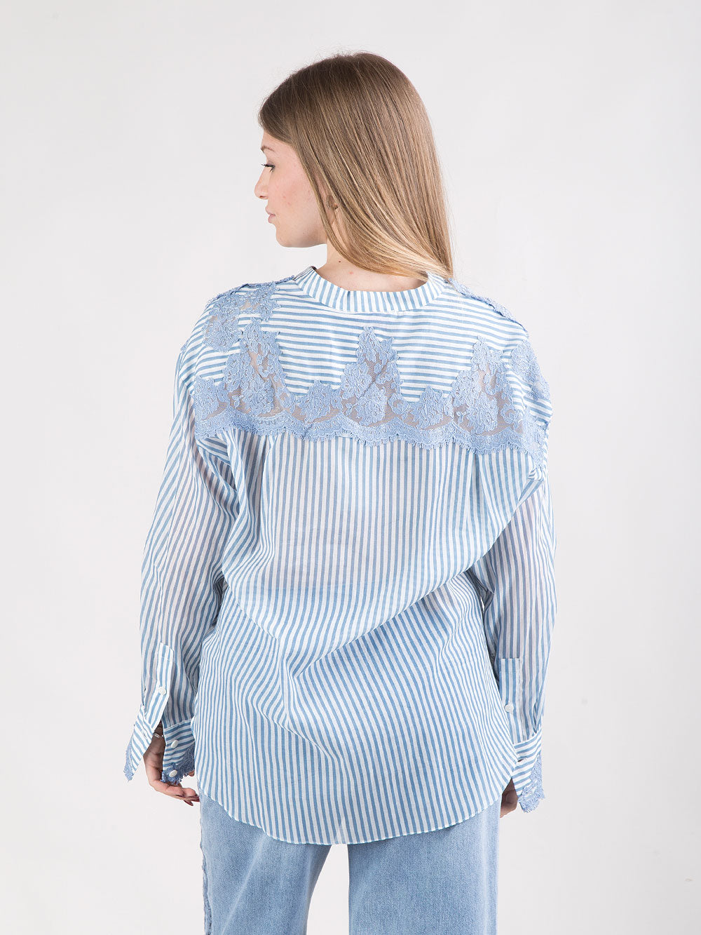 La camicia si distingue per una linea over dal carattere contemporaneo, realizzata in cotone leggero bacchettato celeste, fresco e piacevole da indossare. Il design è valorizzato dal collo coreana e dalla chiusura con bottoni frontali, che conferiscono al capo un’eleganza essenziale. I ricami sul davanti e sui polsi impreziosiscono la camicia con un tocco raffinato e artigianale, mentre il ricamo sulla schiena aggiunge un dettaglio distintivo che completa il look con personalità. Leggera e ariosa, questa camicia è ideale per outfit sofisticati e versatili della stagione Primavera/Estate.
