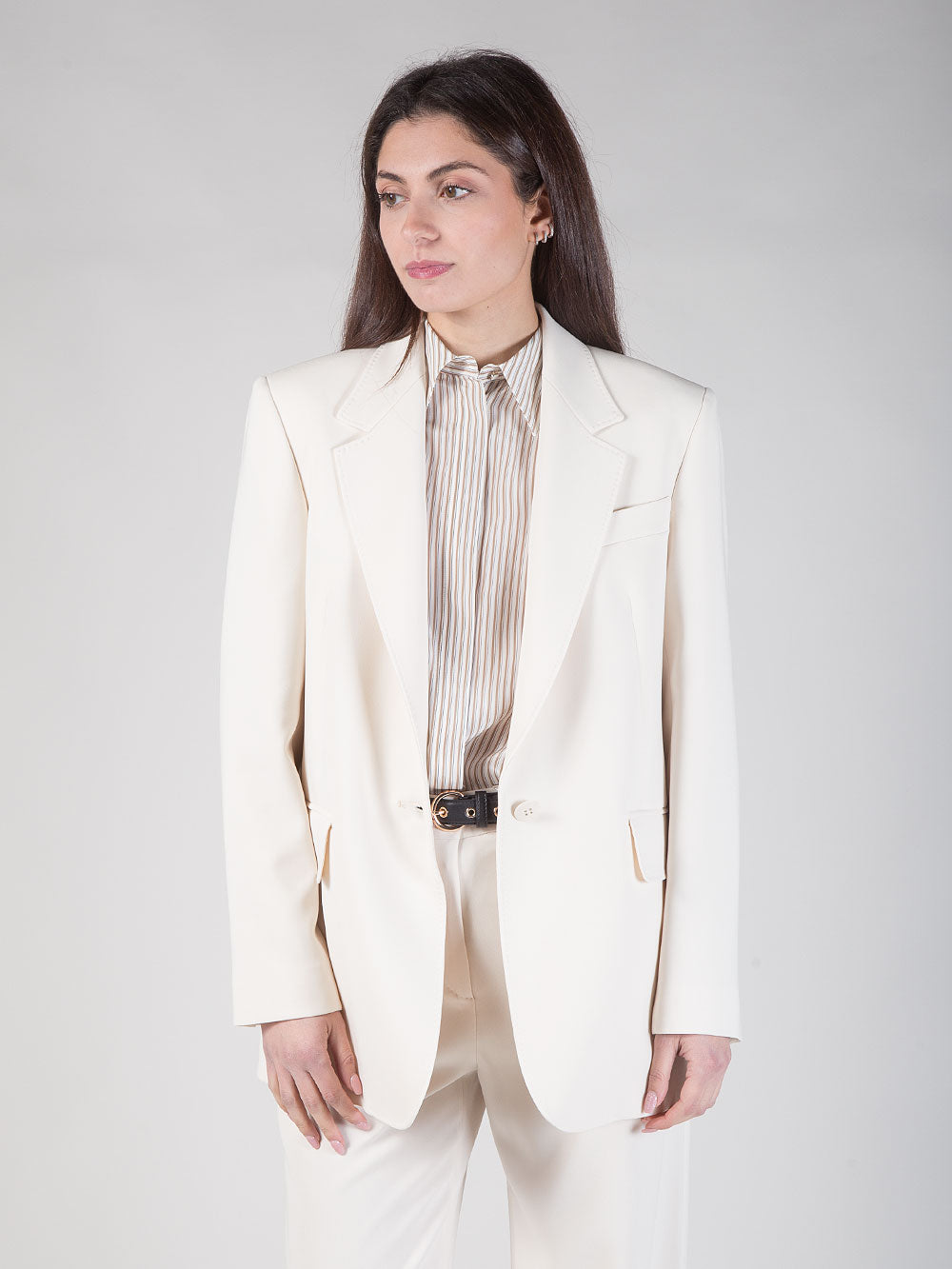 Il modello è rifinito con listino alto in vita, chiusura con zip coperta da patta e gancetto e pratiche tasche laterali alla francese. Sul retro, le tasche a doppio filetto con bottone aggiungono un dettaglio sartoriale. La cintura abbinata in nappa con fibbia circolare definisce il punto vita con un accento raffinato. Passanti per cintura e pinces posteriori completano il design, rendendo questo pantalone da donna perfetto per look eleganti, outfit da ufficio o abbinamenti chic per la stagione primaverile ed estiva.