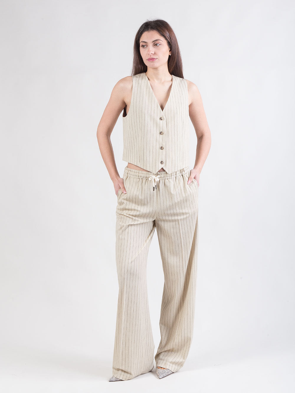 La giacca doppiopetto presenta rever a lancia, chiusura a quattro bottoni, tasca sul petto con pochette e due tasche a patta, con spacco posteriore e bottoni sui polsini per un finish elegante. Il gilet coordinato, completamente foderato, aggiunge struttura e versatilità al look. Il pantalone in piquet, con vita elasticizzata e coulisse, garantisce comfort e vestibilità ottimale, mentre le due tasche laterali completano il design funzionale del capo.