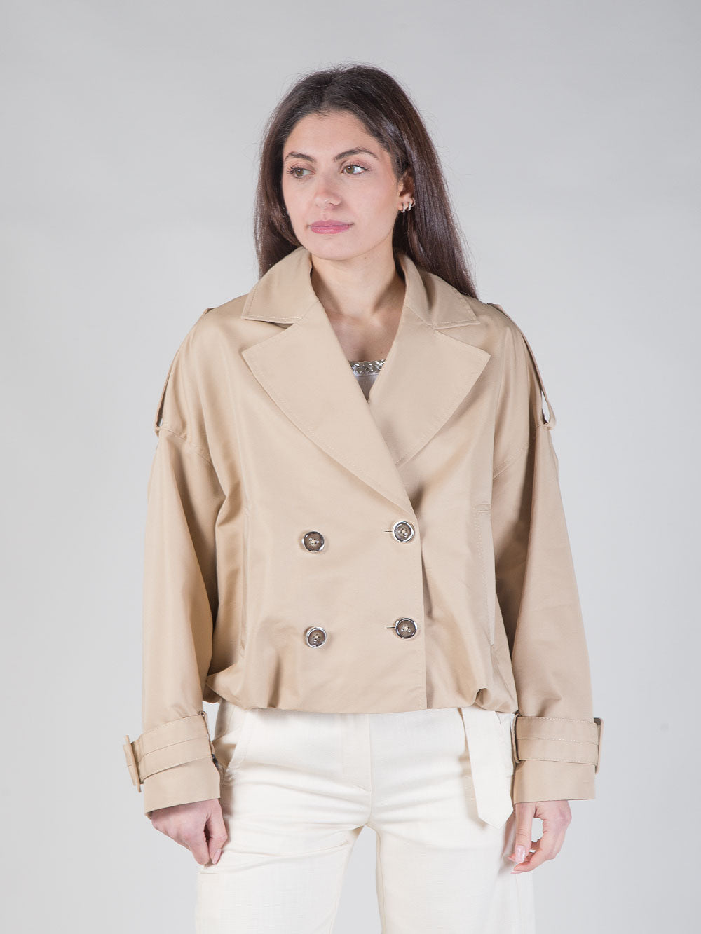 La chiusura doppiopetto e le due tasche laterali completano il design funzionale, mentre l’elegante inserto sul retro a mantella aggiunge volume e movimento al capo. Ideale come passe-partout, questo trench corto accompagna con stile dall’ufficio agli eventi serali, portando un tocco di modernità al guardaroba Primavera/Estate.